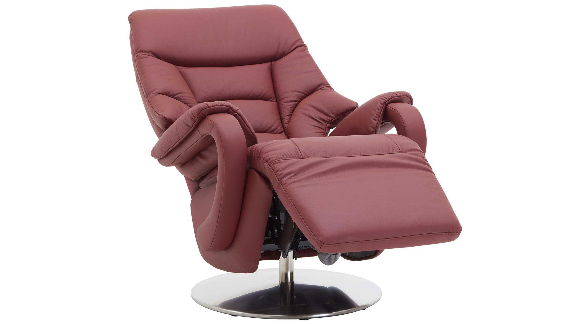 Dieser Relaxsessel kombiniert einen robusten glänzenden Edelstahl-Tellerfuß mit einem stilvollen merlotfarbenen Lederbezug. Durch die optimal aufeinander abgestimmten Materialien und Farben strahlt der Fernsehsessel moderne Eleganz aus. Für die nötige Stabilität sorgt der Stahlrohrrahmen. Er macht den TV-Sessel bis 130 kg belastbar. Die Maße des hochwertig verarbeiteten Relaxsessels belaufen sich auf ca. 80 x 116 x 80 cm (BxHxT), bei einer Sitzhöhe von ca. 49 cm und einer Sitztiefe von ca. 55 cm.