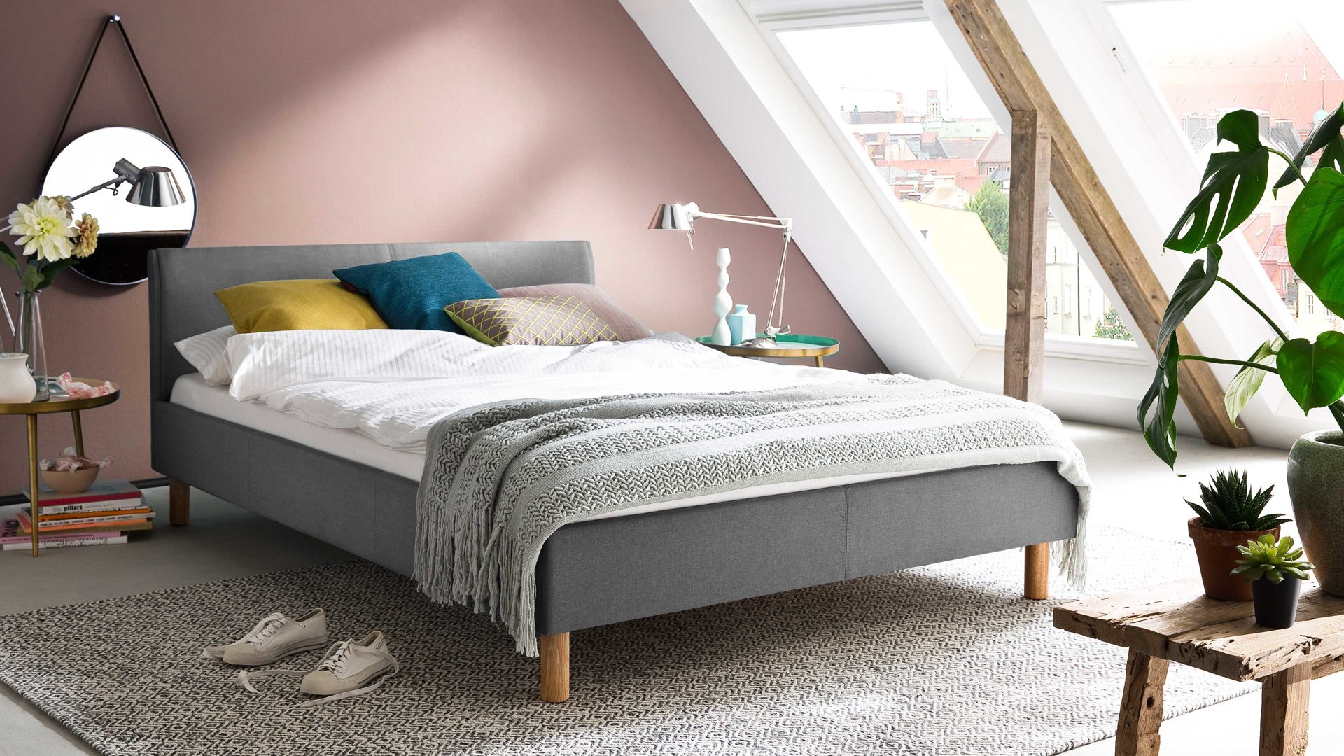 • Die Abbildung zeigt ein Wohnbeispiel, welches auch Dekoration sowie separat erhältliches Zubehör enthält. Im Lieferumfang enthalten ist das Bettgestell mit Polsterkopfteil und Rollrost.