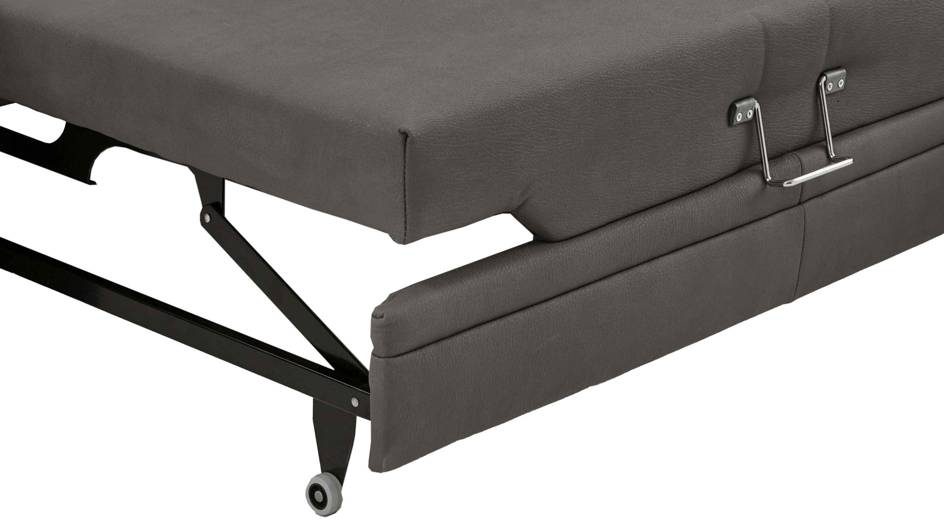 So geht's: Ziehen Sie die Sitzfläche mit dem verchromten Metallgriff nach vorn und leicht nach oben aus. Die so erzielte Flächenerweiterung beträgt ca. 179 x 123 cm (LxB). Durch die Kaltschaumpolsterung auf einer Wellenunterfederung und den hochwertigen schwarzen Drellbezug gewährleistet die Liegefläche hohen Komfort.