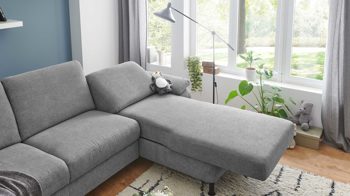 Er ist mit trendig denimfarbenem Mikro-Chenillestoff bezogen, der edle Gemütlichkeit ausstrahlt und mit verschiedenen Einrichtungen bestens harmoniert. Runde alufarbene Metallfüße vervollständigen das attraktive Design und verleihen dem Polsterhocker überdies die nötige Standfestigkeit.