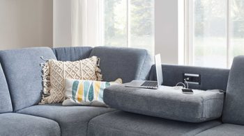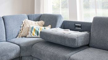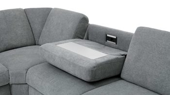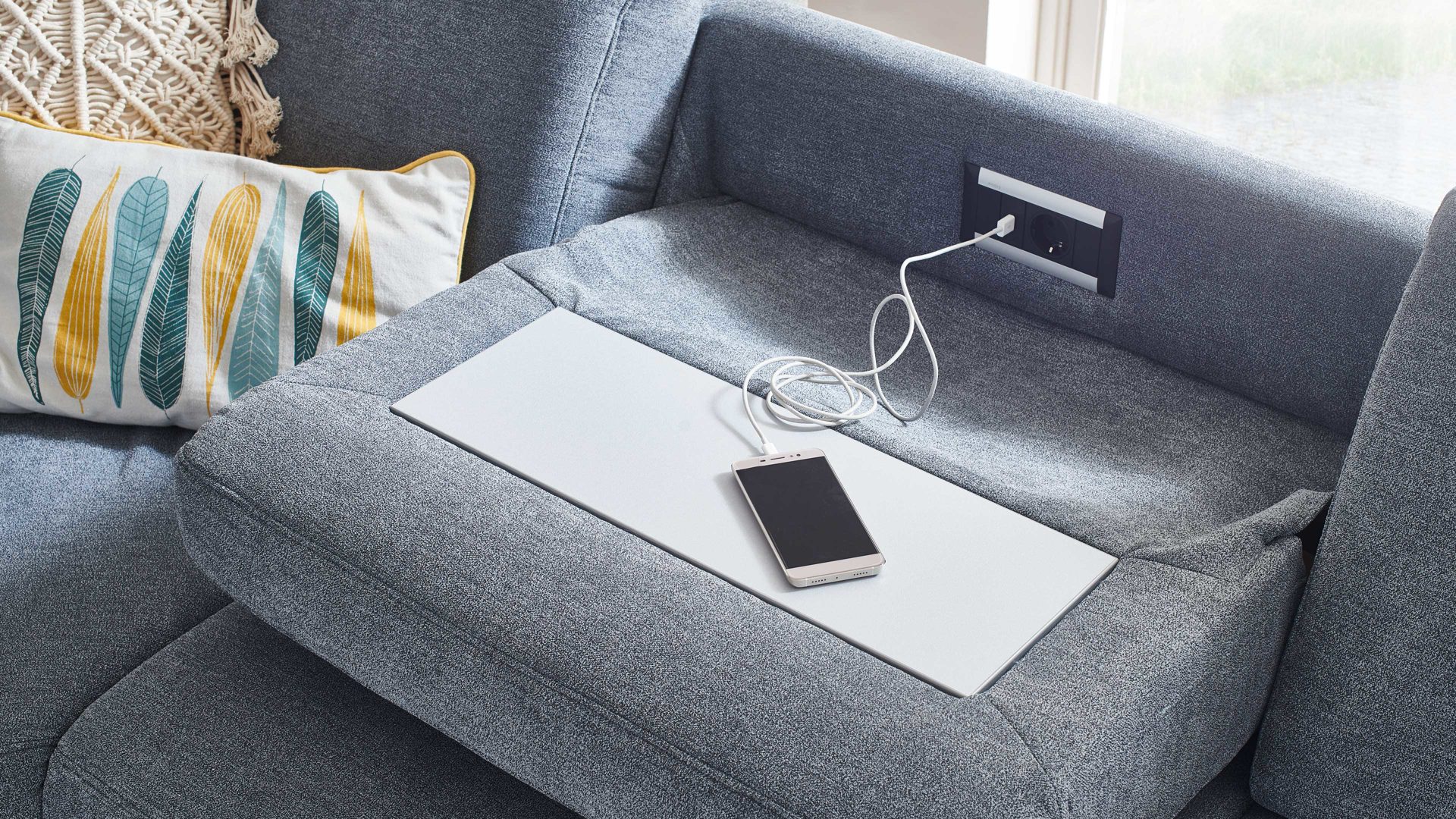 Die Funktionsablage FA ist ein Mehrpreis-Zubehör für die Rückenlehnen der Sofas mit denimfarbenem Stoffbezug aus dem Modulmaster Programm MM-ZE1129. Auf der Rückseite des Rückenpolsters ist eine aluminiumfarbene Ablageplatte in den Bezug eingearbeitet - sie greift den Ton der Couchfüße auf. Indem Sie das Rückenpolster nach vorne klappen, schaffen Sie eine praktische Ablagefläche samt Steckdose und USB-Anschluss.