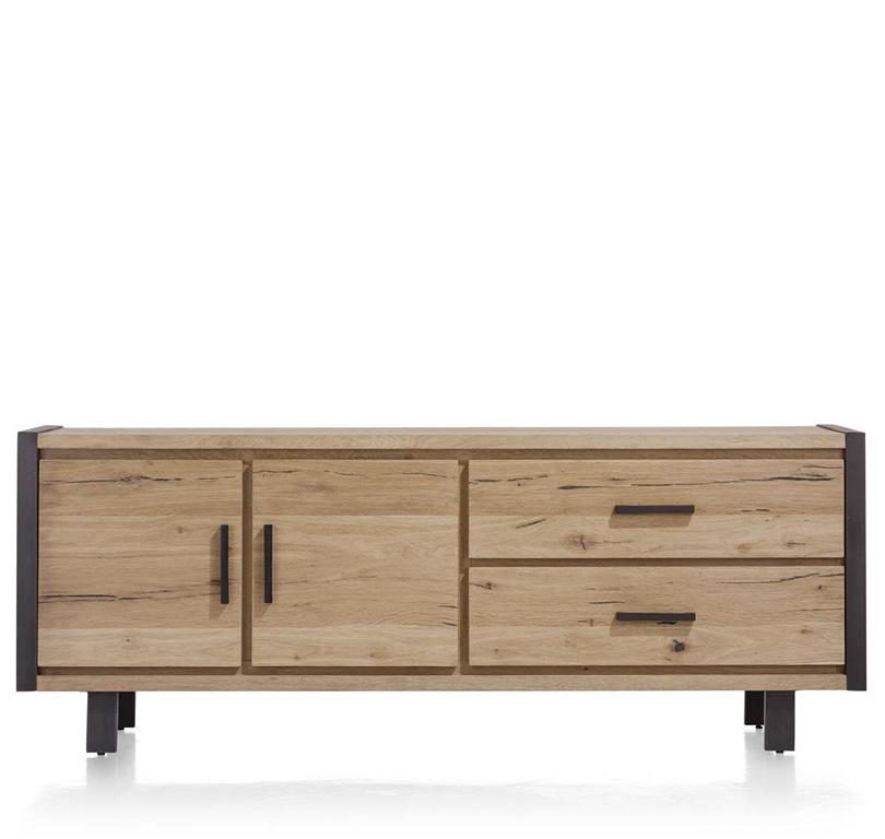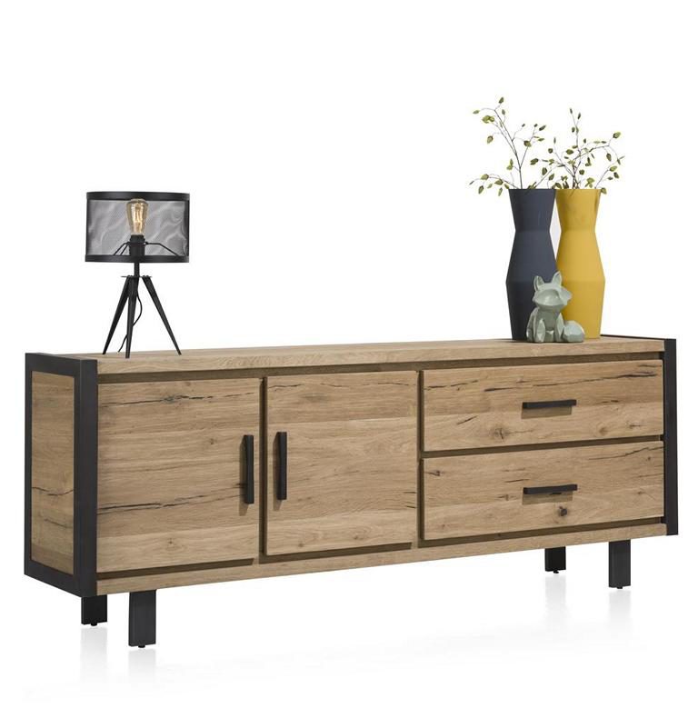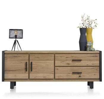 Das Sideboard Brooklyn 37136RWB von Habufa wird aus massiver Eiche und 3D Eichenfurnier (MDF) gefertigt. Die Oberfläche ist bewusst natürlich belassen, um dem Sideboard ein natürlichen und handwerklichen Charakter zu verleihen. Dazu dienen Astlöcher, Wachstumsrisse und Unebenheiten im Holz. Manche Astlöcher werden mit schwarzem Spachtel gefüllt, der optimal mit den Metallapplikationen in der Front harmoniert und dem Möbelstück einen used Look verleiht. Für eine moderne Optik sorgen die vier Metallfüße, auf dem das Sideboard Brooklyn von Habufa gelagert ist. Mit einer Breite von ca. 210 cm, den beiden Schubkästen und die große Nische hinter den Drehtüren, bietet es viel Platz zum Verstauen. Das Möbelstück wird montiert geliefert und besitzt eine hohe Sperrigkeit, bitte sorgen Sie dafür, dass es zu seinem Verwendungsort getragen werden kann.