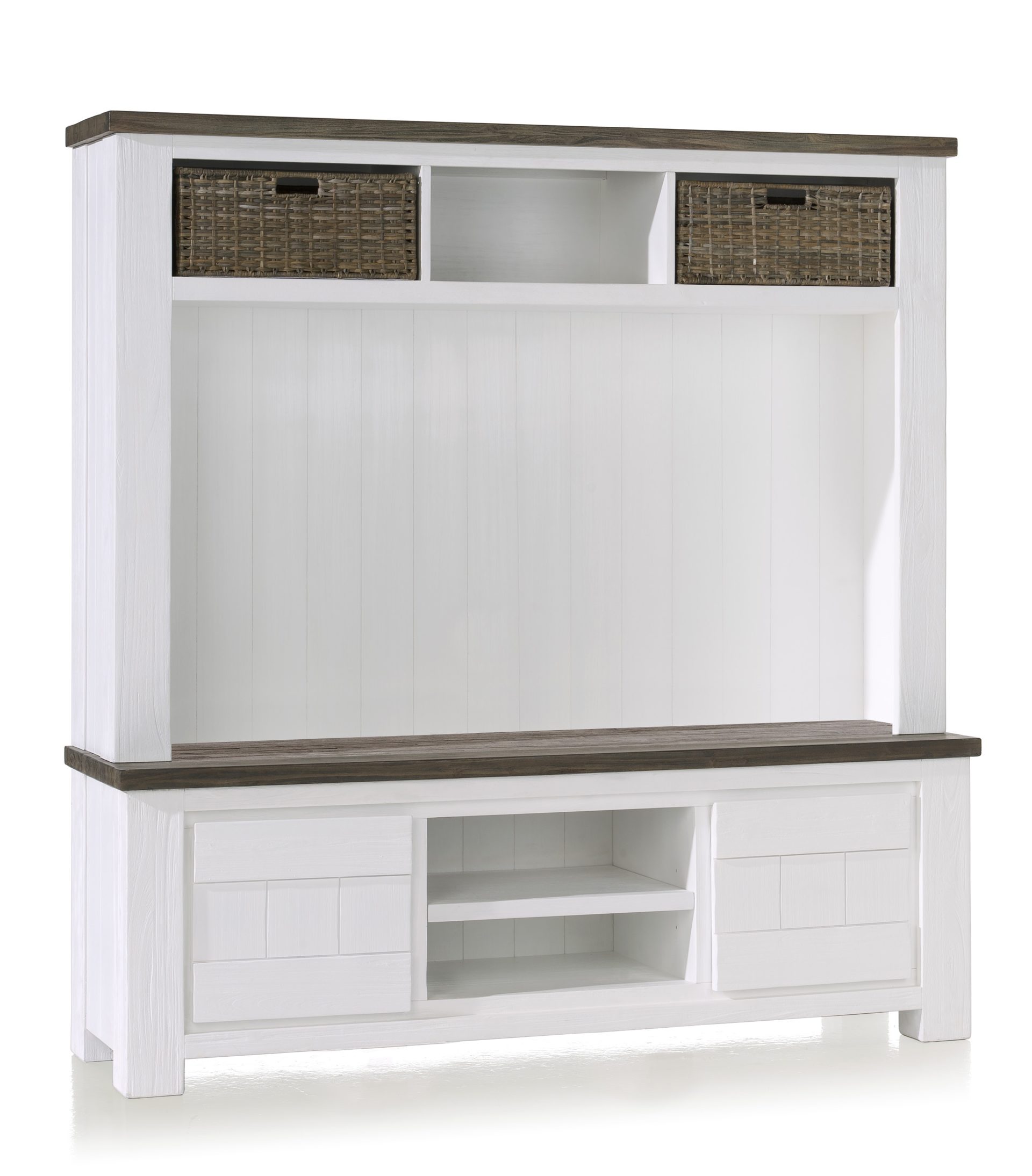 Der elegant designte Sideboardaufsatz 24703WG, aus der Deaumain-Serie des holländischen Herstellers Habufa, bietet genügend Fläche für Dekor oder für ihren Fernseher. Verschönern Sie ihren Wohnraum mit einem traditionell gefertigten Aufsatz aus teilmasiver Akazie. Verstauen Sie Dinge in den hochwertigen Flechtkörben und bringen Sie noch mehr Ordnung in ihr Zuhause. Die naturbelassene Oberfläche trägt eine, für die Deaumain-Serie typische, einzigartige Holzprägung und lässt das Möbelstück einen modernen Landhausflair annehmen. Durch die Kombination der Farben pampas grey und off white wird das Möbelstück zum echten Hingucker in ihrem Wohnzimmer und sorgt für eine warme und ländliche Atmosphäre.