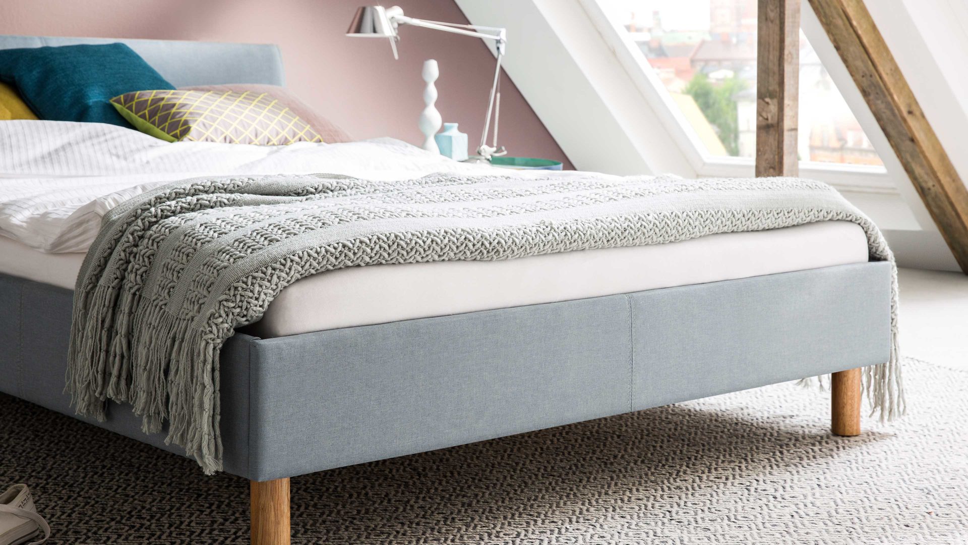eisblaues Flachgewebe Aspen 84 & Holzfüße - Liegefläche ca. 140 x 200 cm