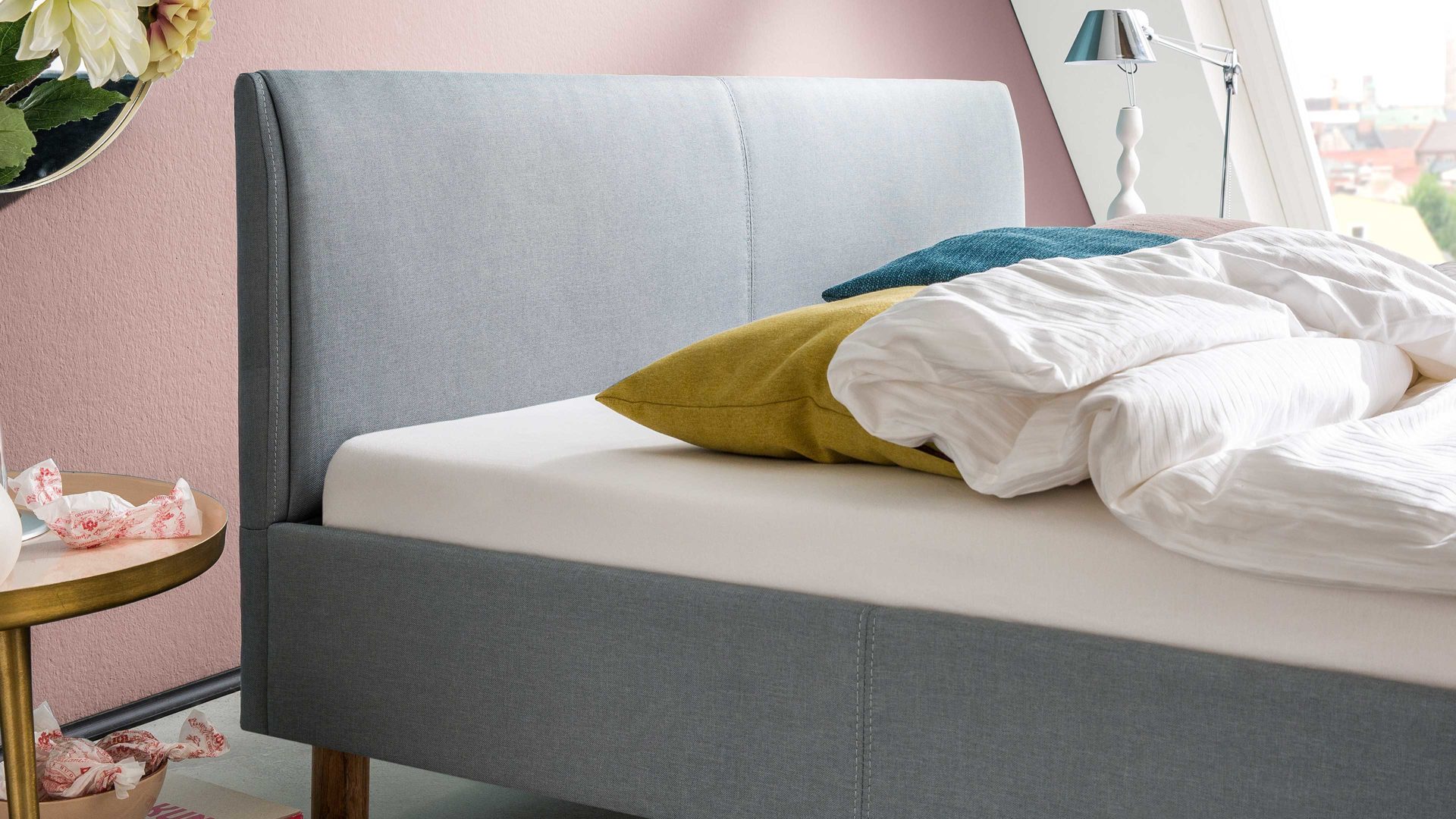 • Die Abbildung zeigt ein Wohnbeispiel, welches auch Dekoration sowie separat erhältliches Zubehör enthält. Im Lieferumfang enthalten ist das Bettgestell mit Polsterkopfteil und Bettkasten.