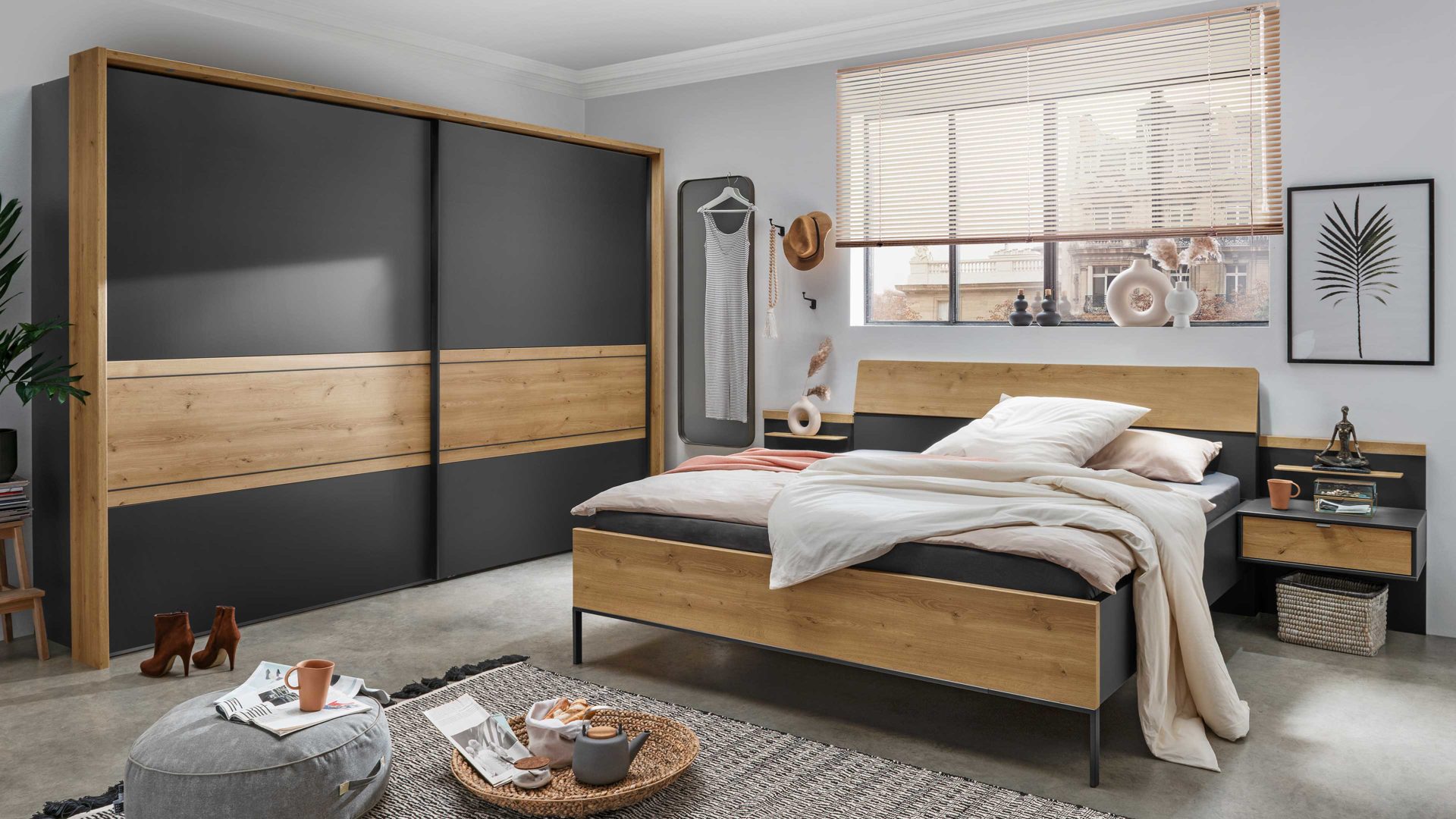 Alternativ ist die Schlafzimmerserie auch in Lack Basalt mit Echtholz Balkeneiche erhältlich. Sie können also das Design wählen, das am besten zu Ihrem Geschmack und Ihrem Schlafzimmer passt.