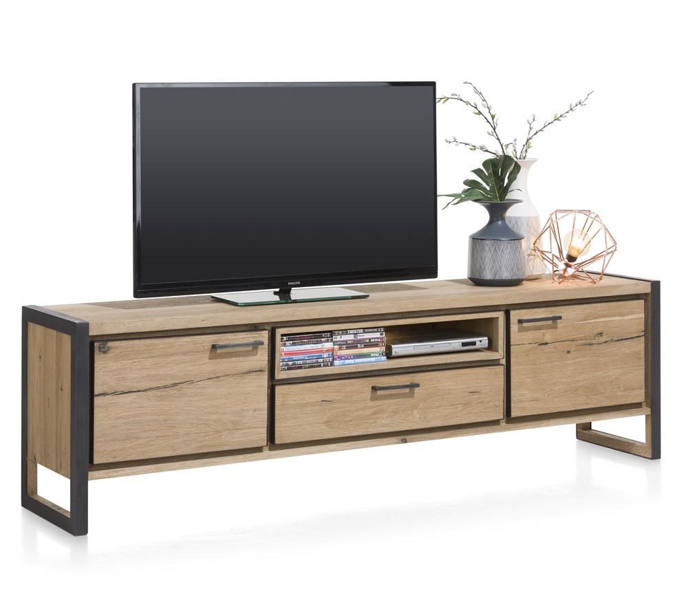 Das Lowboard 36352RWB aus dem Hause Henders und Hazel ist Teil der modernen Wohn- und Speisezimmermöbelserie Metalo, die aus Eichenfurnier gefertigt wird. Das Holz trägt die Farbe railway brown und bringt mit seiner natürlichen Ausstrahlung viel Gemütlichkeit in Ihre vier Wände. Die umrahmenden Metallelemente, in der Farbe desert black, zeugen von elegantem Design und bilden sehenswerte Kontrastelemente, die das Möbelstück zu einem wahren Blickfang machen. Mit einer 210 cm breiten Abdeckplatte findet selbst ein größerer Smart-TV Platz auf diesem Lowboard, während Receiver und Spielkonsole bequem in der beleuchteten Nische platziert werden können und weiteres Fernsehzubehör hinter zwei Türen und einer Schublade verstaut werden kann.