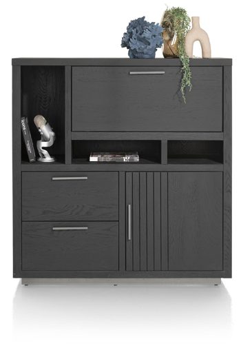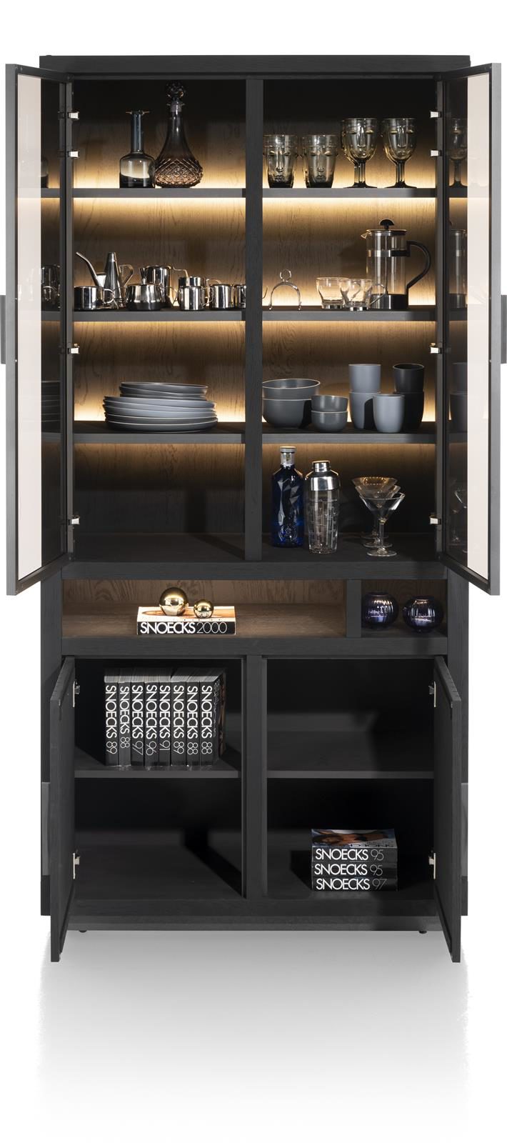 Das markante Design wird durch subtile Metallakzente ergänzt, die dem Vitrine eine moderne Note verleihen und ihn zu einem Blickfang in jedem Raum machen. Dank des integrierten Soft-Close-Systems für Türen und Schubladen genießen Sie ein sanftes und leises Schließen, was nicht nur den Komfort erhöht, sondern auch die Langlebigkeit des Möbels gewährleistet.