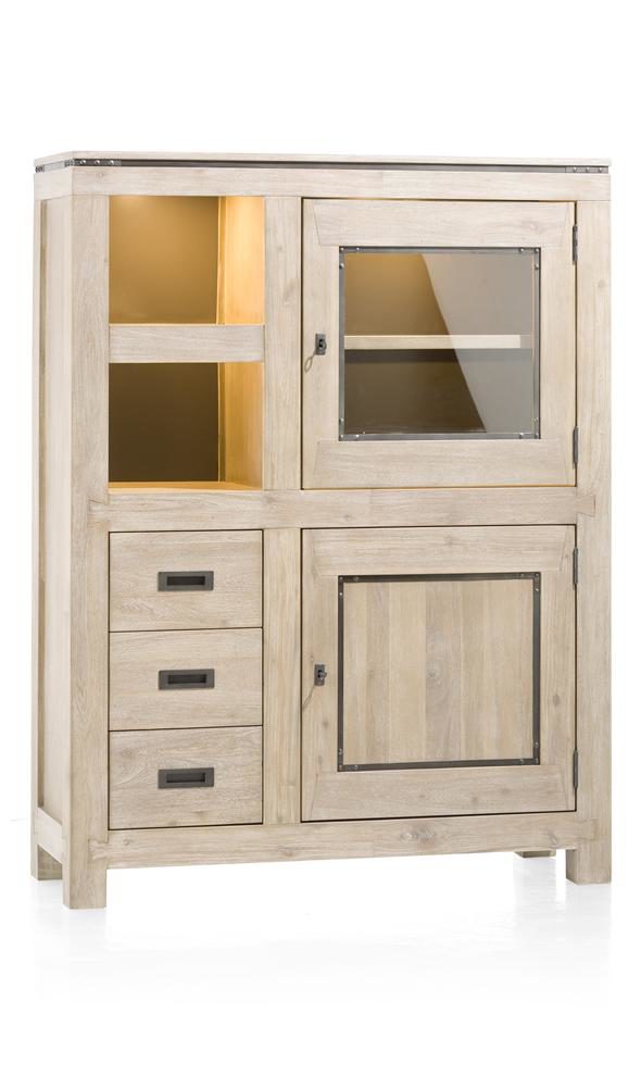 Der Habufa Panay Schrank mit der Artikelnummer 30547TBG wurde bewusst vom niederländischen Hersteller im modernen Landhausstil gehalten. So kommt der Korpus des Schrankes gefertigt aus teil massivem Akazien Holz welches in der Farbe tibet grey lackiert ist. In Kombination mit den Griffen und Applikationen aus Metall in der Farbe Anthrazit kommt ein hervorragender Kontrast zustande, welcher den massiven und rustikalen Stil des Schrankes deutlich widerspiegelt.