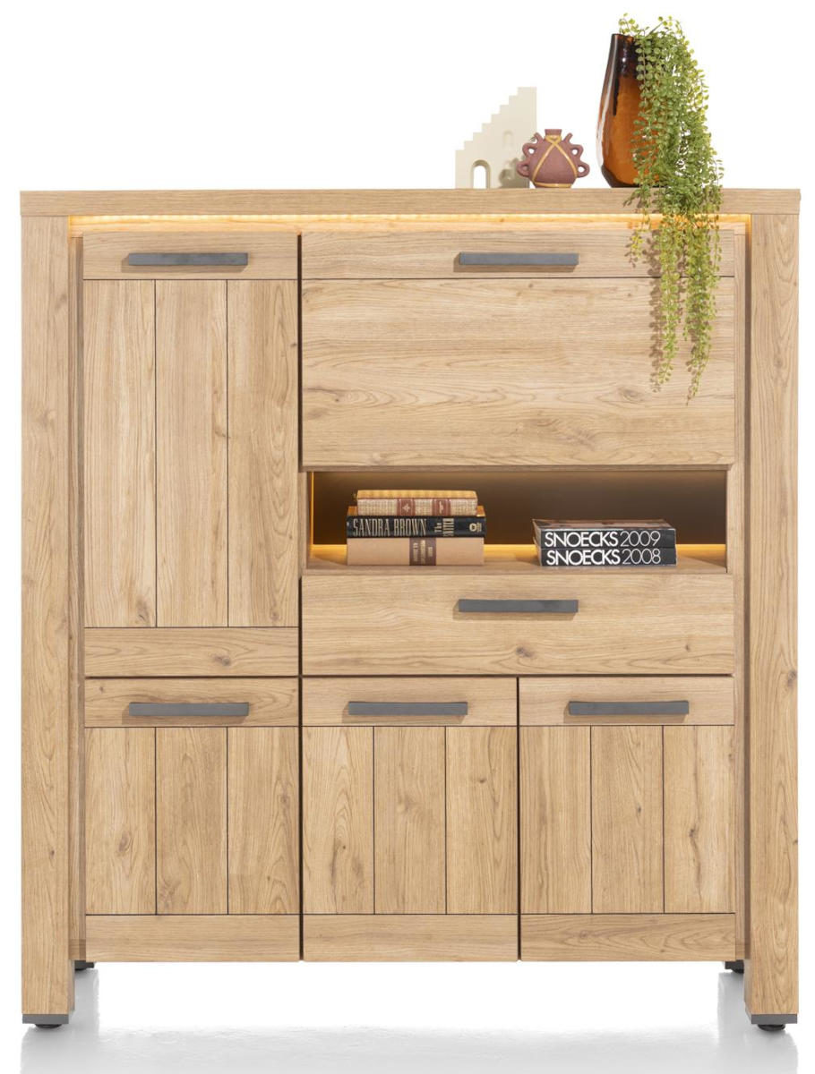 Das Highboard Delmonte von Henders & Hazel vereint eleganten Landhausstil mit modernen Akzenten. Ein Highlight ist der integrierte LED-Streifen, der mit einem Touch-Dimmer gesteuert wird und für eine einladende Atmosphäre sorgt. Das beleuchtete offene Fach setzt dekorative Akzente. Hergestellt aus pflegeleichtem Primo Laminato in Eiche Natur, bietet das Highboard den Look von Massivholz, ist jedoch leichter, kratzfest und langlebig. Mit 130 cm Breite und 140 cm Höhe bietet es viel Stauraum durch vier Schranktüren, eine Klappe, eine große Schublade und ein offenes Fach.
