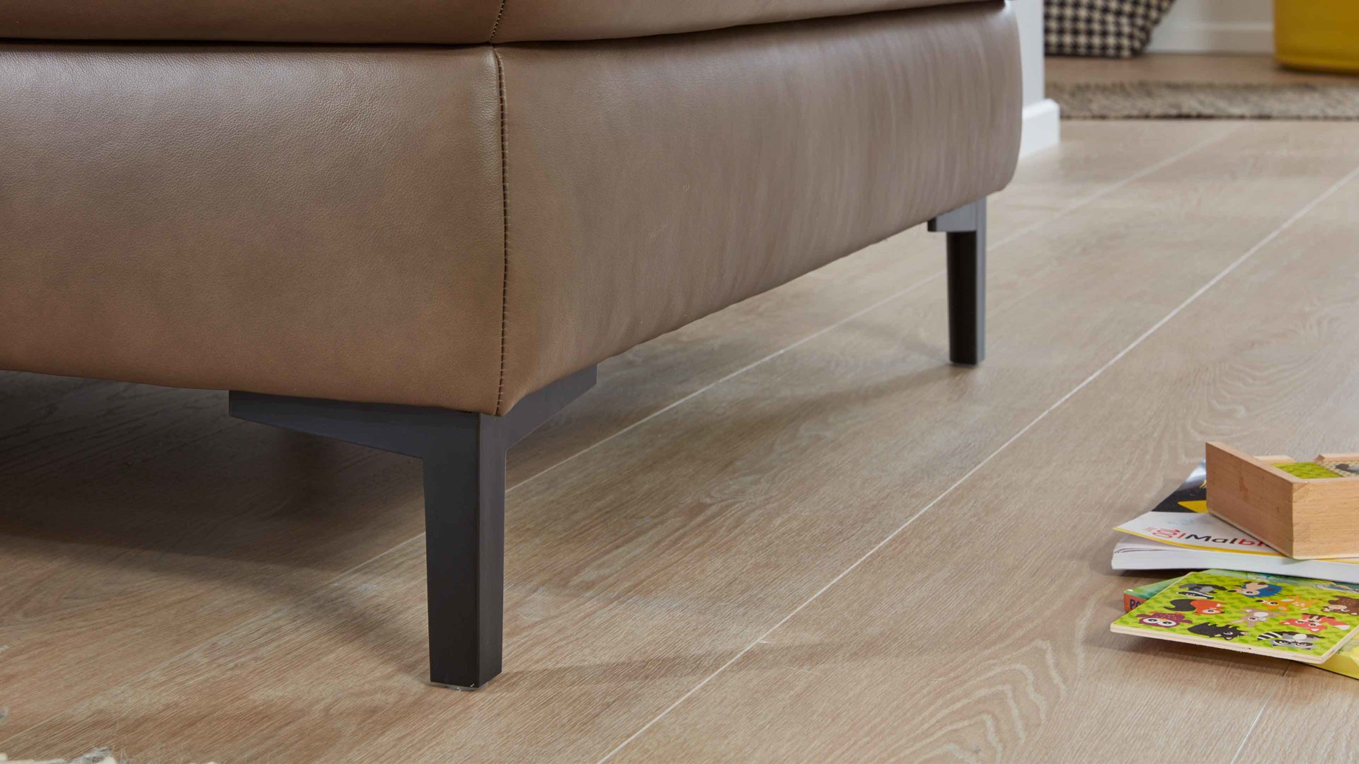 Der XXL-Hocker aus dem Modulmaster-Polsterprogramm MM-PN1137 kombiniert steinfarben pigmentiertes Glattleder mit mattschwarzen Metall-Profilfüßen. Er präsentiert sich modern und elegant.