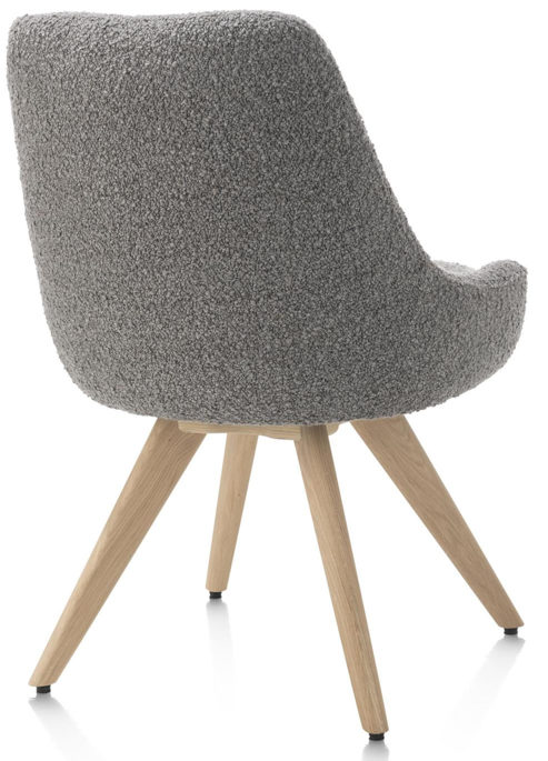 Der Stuhl Rocco von Henders & Hazel kombiniert modernes Design mit hohem Komfort. Ausgestattet mit einem Taschenfederkern und einem drehbaren Sitz bietet er optimalen Sitzkomfort. Der weiche Bouclé-Stoff ist in den eleganten Farben Creme sowie Leber erhältlich. Die breite Rückenlehne sorgt für zusätzlichen Halt, während die vier stabilen Metallbeine in Graphit dem Stuhl eine moderne Note verleihen. Alternativ sind auch Holzfüße verfügbar. Der Rocco ist zudem als Armlehnenstuhl erhältlich und eignet sich ideal für verschiedene Räume – vom Esszimmer bis zum Wohnzimmer.