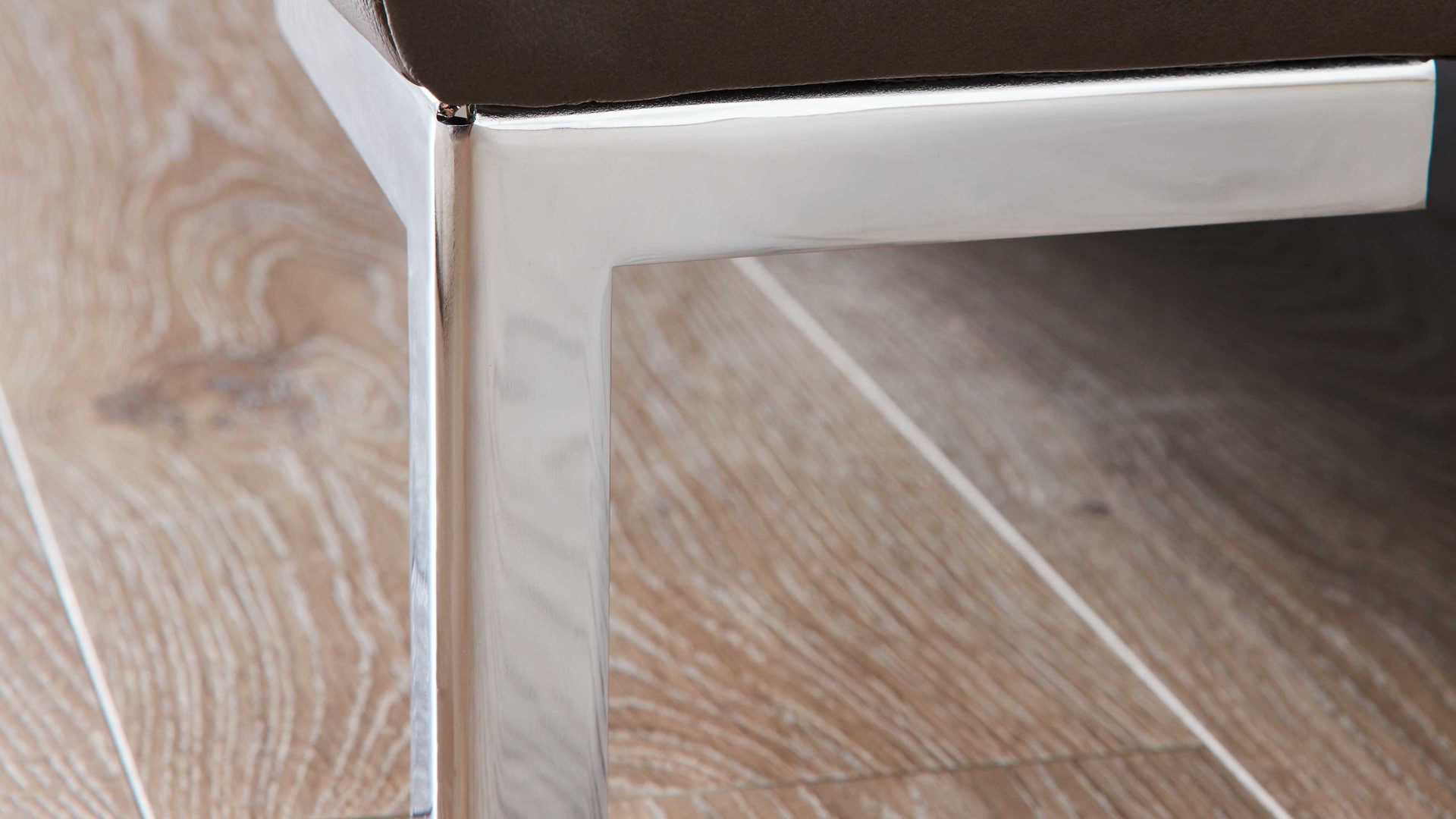 Der XXL-Hocker überzeugt nicht nur durch Funktion, sondern auch durch sein edles Erscheinungsbild. Der dunkelgraue Lederbezug mit weißer Kontrastnaht verleiht ihm eine moderne, elegante Note, während die silberglänzenden Metallfüße für Leichtigkeit und Stabilität sorgen. Die bodenfreie Gestaltung wirkt nicht nur luftig, sondern ist auch praktisch – perfekt für Saugroboter und eine einfache Reinigung.