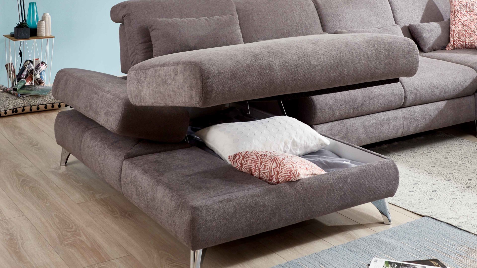 Mit der praktischen Möglichkeit, die Sitzfläche im Handumdrehen hochzuklappen und den Raum darunter zur Aufbewahrung verschiedener Gegenstände (Kuscheldecken, Zierkissenbezüge et cetera) zu nutzen, verwandelt sich der jeweilige Longchair in ein multifunktionales Möbel - flexibel einsetzbar und gemütlich. Der Mehrpreis wird pro Element berechnet.