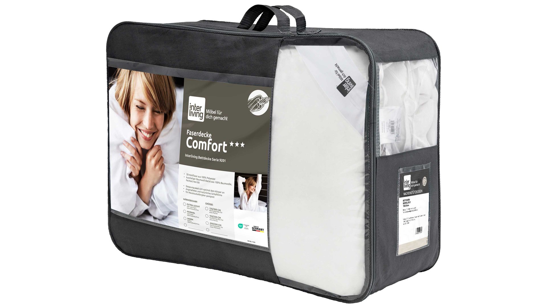 Noch besser: Die atmungsaktive Tragetasche ist gleich mit dabei, damit du deine Bettdecke immer gut geschützt aufbewahren oder bequem transportieren kannst.