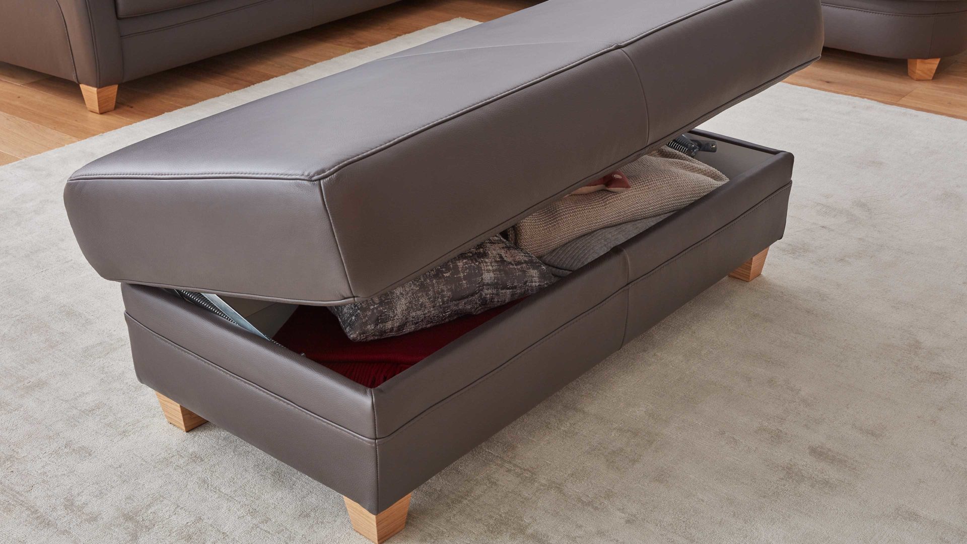 Der aufklappbare Polsterhocker schafft gleichzeitig Stauraum im Wohnbereich und bewahrt Kissen oder Decken ordentlich auf. Dank der Maße von ca. 129 x 47 x 64 cm (BxHxT) und der Sitzhöhe von