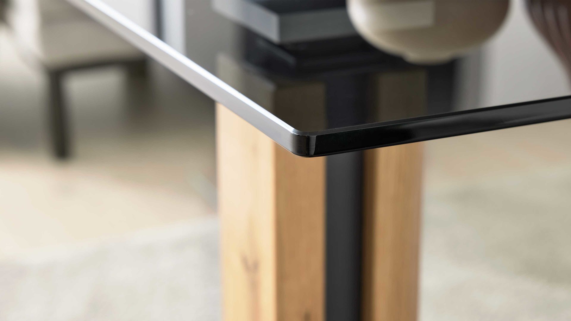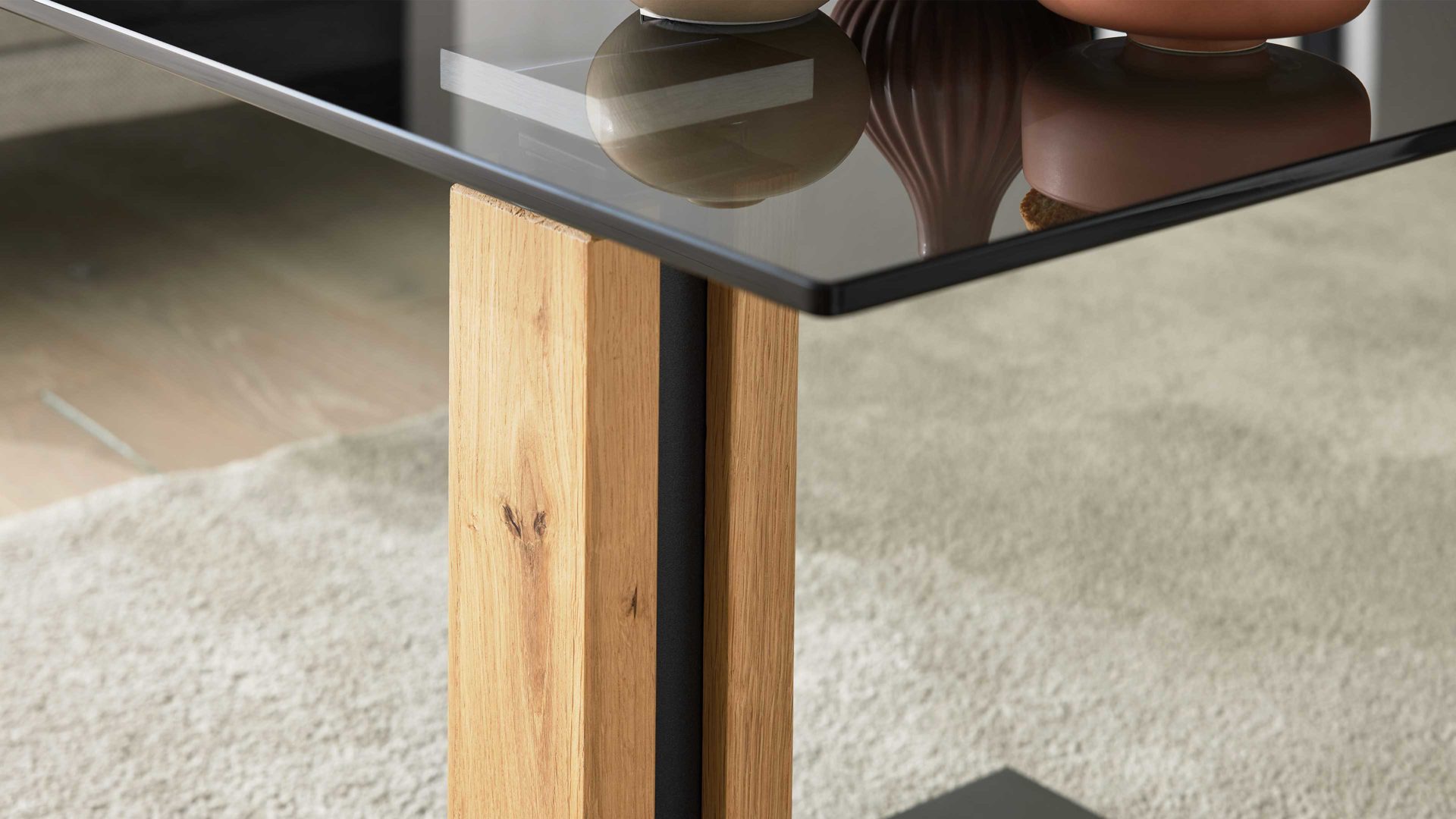 Ein besonderes Highlight ist die 10 mm starke ESG-Glasplatte, eingefasst in einen lackierten Metallrahmen, der dem Tisch eine feine Kontur und zusätzliche Stabilität verleiht. Die Metallelemente und die MDF-Bodenplatte sind anthrazit-metallicfarben lackiert und setzen moderne Akzente, die das hochwertige Erscheinungsbild perfekt abrunden. Durch die Kombination von Glas, Holz und Metall entsteht ein ausgewogener Mix aus Natürlichkeit, Leichtigkeit und industrieller Eleganz.