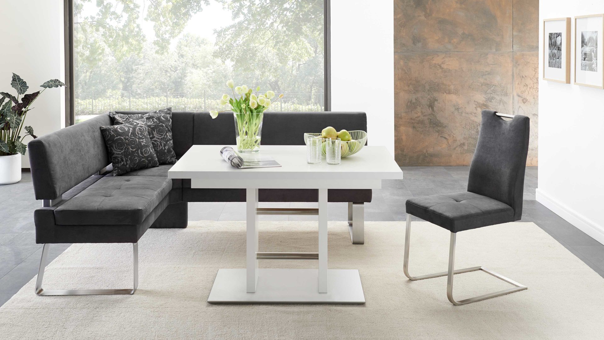 Als stabilisierende Basis fungiert eine klassisch-edelstahlfarbene Bodenplatte. Auch die Querstreben des Gestells sind im Edelstahlton gehalten. Durch die strahlend weißen Kunststoffoberflächen, die sowohl das Gestell als auch die Tischplatte zieren, erscheint der Esszimmertisch besonders leuchtend und einladend.