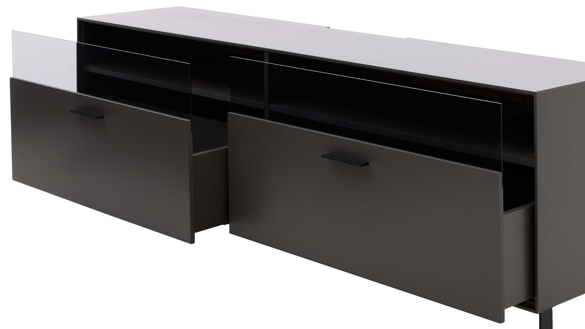 Zwei Schubladen mit Glaseinsatz im oberen Bereich bieten praktischen Stauraum für Technik, Zubehör oder Alltagsgegenstände. Dank des integrierten Kabeldurchlasses bleibt die Kabelführung stets ordentlich und aufgeräumt – ideal, wenn du TV-Geräte, Receiver oder Spielekonsolen anschließen möchtest.