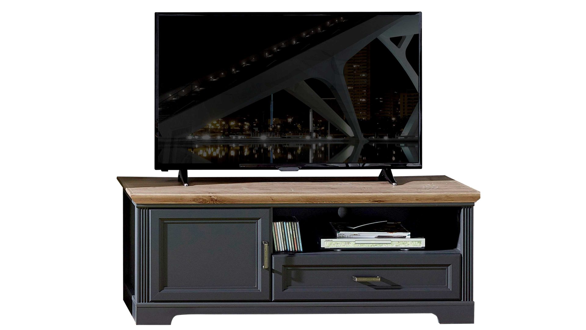 Das Medien-Lowboard Jasmin kombiniert graphitfarbene Kunststoffoberflächen mit Details in Artisan-Eiche-Nachbildung. Durch diese äußerst spezielle Optik strahlt es antikes Flair aus und bringt ein tiefgründig-elegantes Ambiente in Ihren Raum. Antikfarbene Metallgriffe runden den TV-Schrank absolut stilsicher ab.