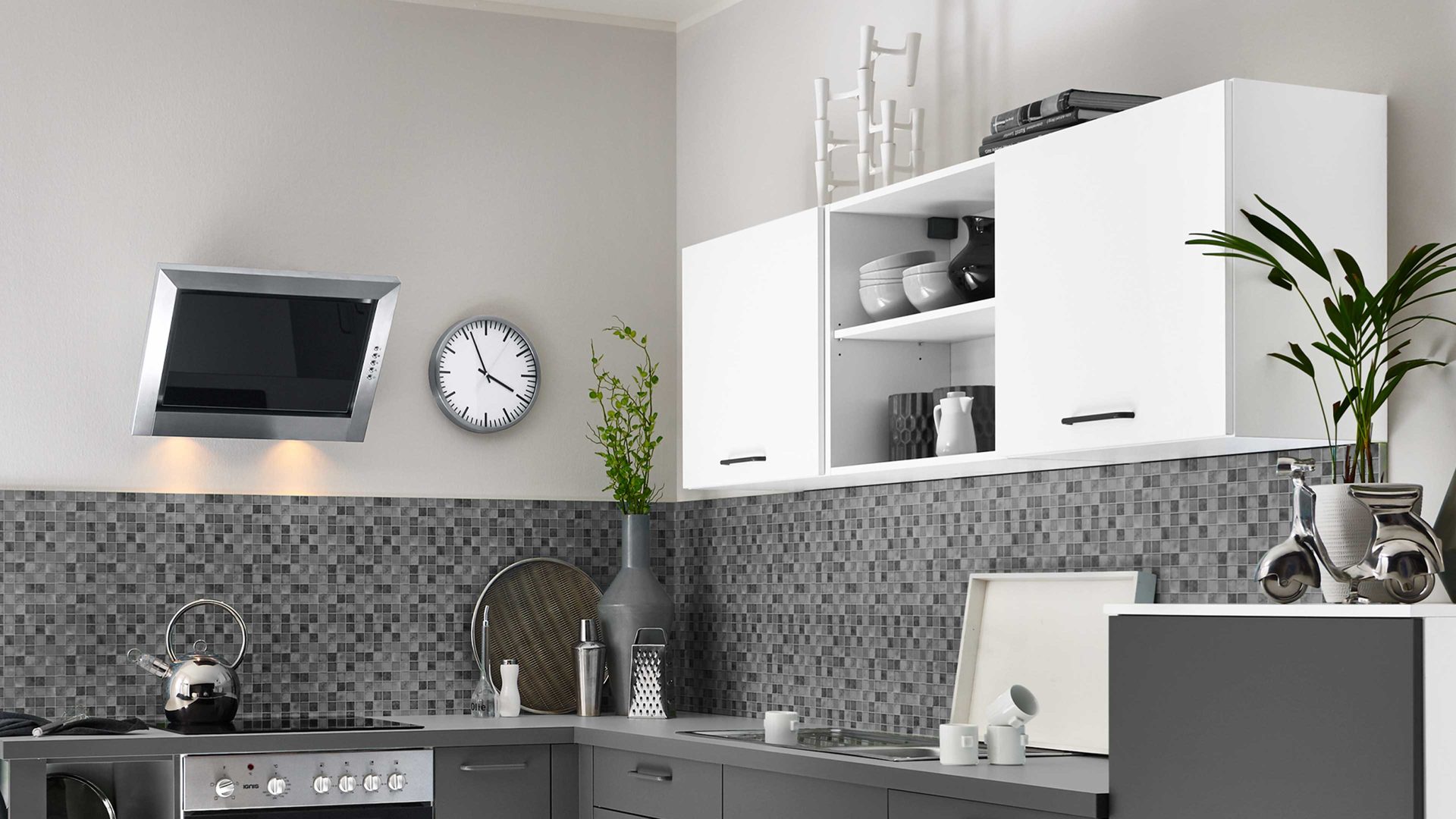 Als Highlights der individuell planbaren Küche fungieren der offene Regalabschluss, der halbhohe Kühlschrankumbau und die kopffreie Dunsthaube. Optional können Sie eine Armatur für die Einbauspüle und eine Geschirrspülmaschine für eine bequemere Geschirrreinigung ergänzen. Die hochwertige Einbauküche ist Made in Germany.