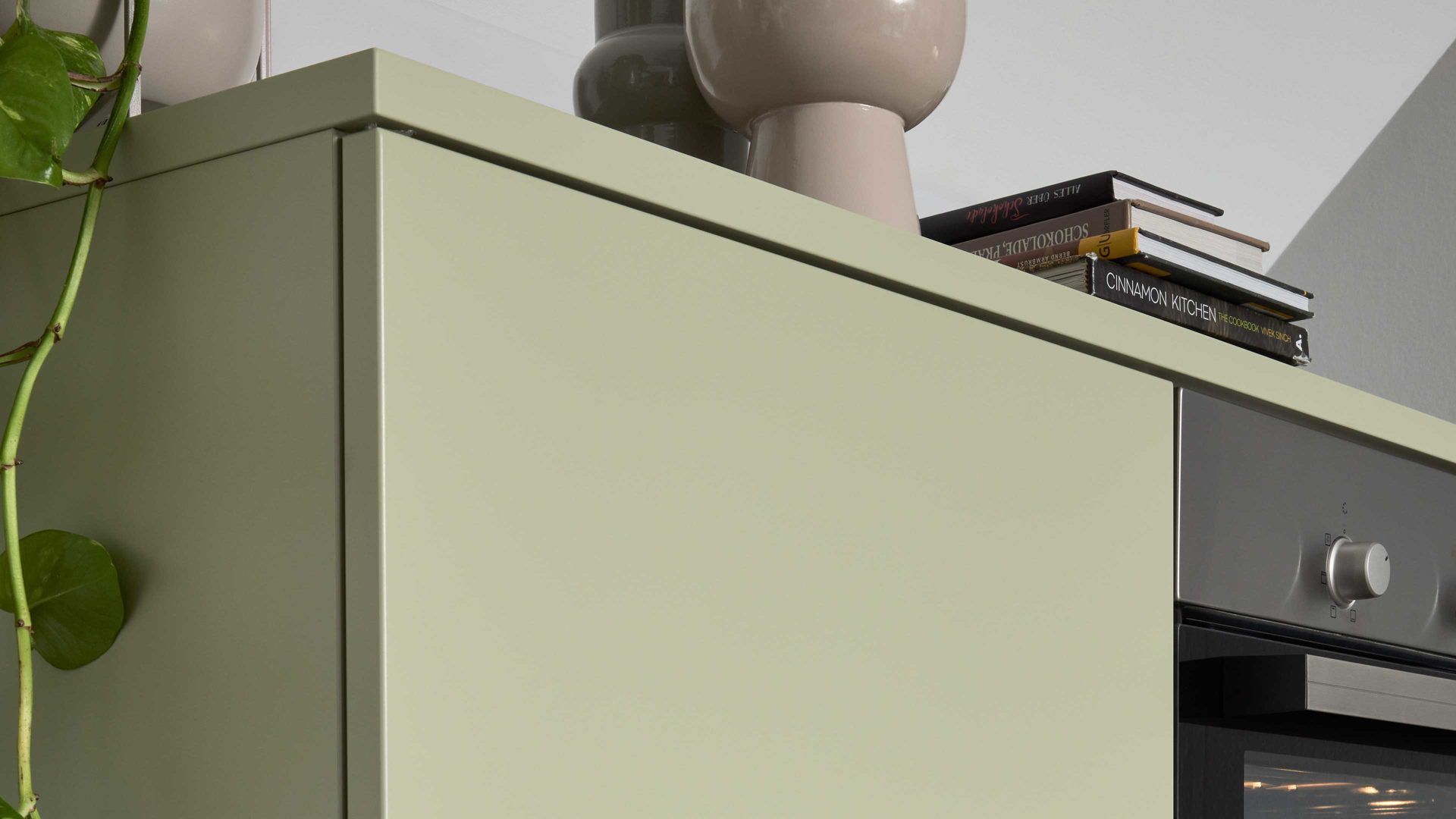 Die Interliving Küche Serie 3071 verbindet softmattes Arcticweiß mit dem frischen Farbton Avocado und schafft so eine besonders moderne, einladende Atmosphäre. Für einen harmonischen Kontrast sorgen Arbeitsplatten, Nischenverkleidung und die angesetzte Theke in graphitsilberfarbener Eiche-Nachbildung, die dem Design eine warme, natürliche Note verleihen.