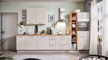 supermattes Kaschmirgrau und Arbeitsplatten in honigfarbener Eiche-Nachbildung