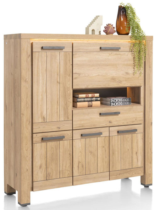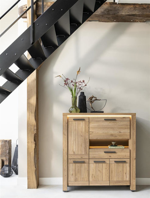 Das Highboard Delmonte von Henders & Hazel vereint eleganten Landhausstil mit modernen Akzenten. Ein Highlight ist der integrierte LED-Streifen, der mit einem Touch-Dimmer gesteuert wird und für eine einladende Atmosphäre sorgt. Das beleuchtete offene Fach setzt dekorative Akzente. Hergestellt aus pflegeleichtem Primo Laminato in Eiche Natur, bietet das Highboard den Look von Massivholz, ist jedoch leichter, kratzfest und langlebig. Mit 130 cm Breite und 140 cm Höhe bietet es viel Stauraum durch vier Schranktüren, eine Klappe, eine große Schublade und ein offenes Fach.