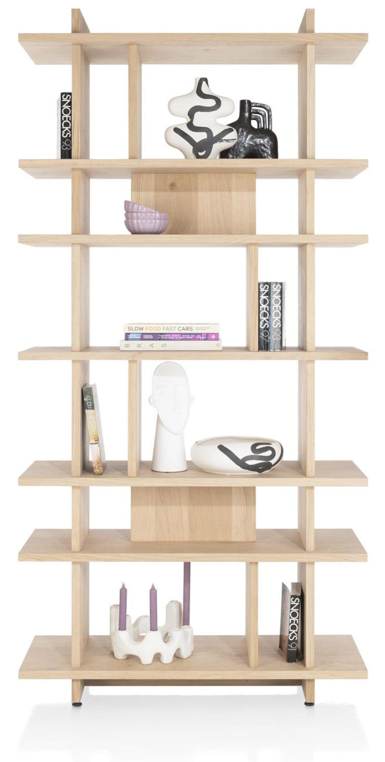 Mit seinem offenen Design und zahlreichen Fächern bietet er vielseitige Nutzungsmöglichkeiten, sei es zur Trennung von Räumen oder zur stilvollen Präsentation von Dekoration und persönlichen Gegenständen. Die klare Linienführung und die durchgängige Holzoptik machen den Raumteiler zu einem zeitgemäßen Blickfang in jedem Wohnraum.
