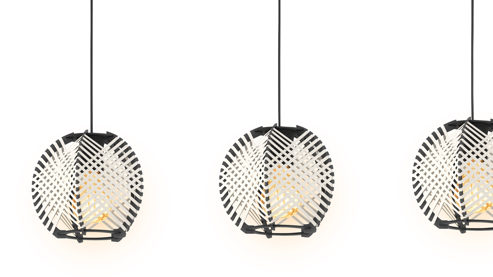 Lampenschirme aus schwarzem Holzwerkstoff umwickelt mit weißem Textilband