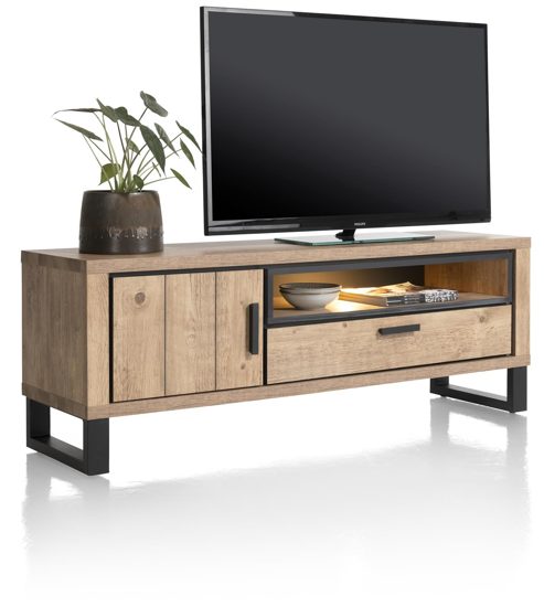 Die Oberfläche des Lowboards ist nicht nur pflegeleicht, sondern auch äußerst kratzfest, was eine langanhaltende Schönheit garantiert. Mit einer Tür, einer Schublade und einer Nische bietet es ausreichend Stauraum für Ihre Multimedia-Geräte, Bücher und andere persönliche Gegenstände.