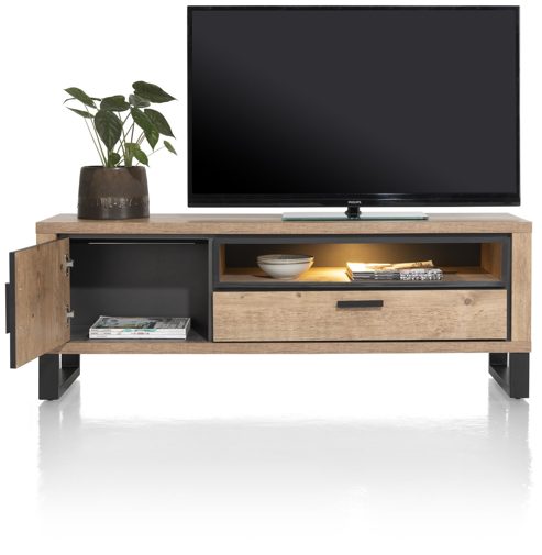 Die integrierte LED-Beleuchtung in der Nische sorgt für eine stimmungsvolle Atmosphäre und setzt Ihre Dekorationen gekonnt in Szene. Darüber hinaus verfügt das Lowboard über ein durchdachtes Kabelmanagement, das lästige Kabelgewirr vermeidet und für eine ordentliche Optik sorgt.