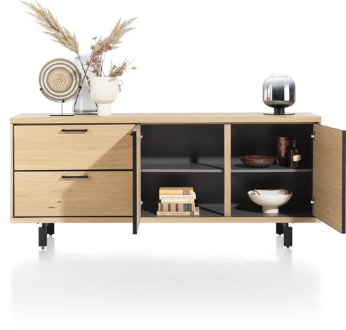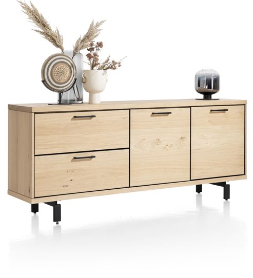 Die Metallakzente entlang der Türen und Schubladenfronten verleihen dem Sideboard eine subtile, industriell inspirierte Ästhetik, die das Gesamtbild harmonisch abrundet. Die Farbe Natur des Eichenfurniers bringt die natürliche Maserung des Holzes wunderschön zur Geltung und verleiht jedem Raum eine warme und einladende Atmosphäre.