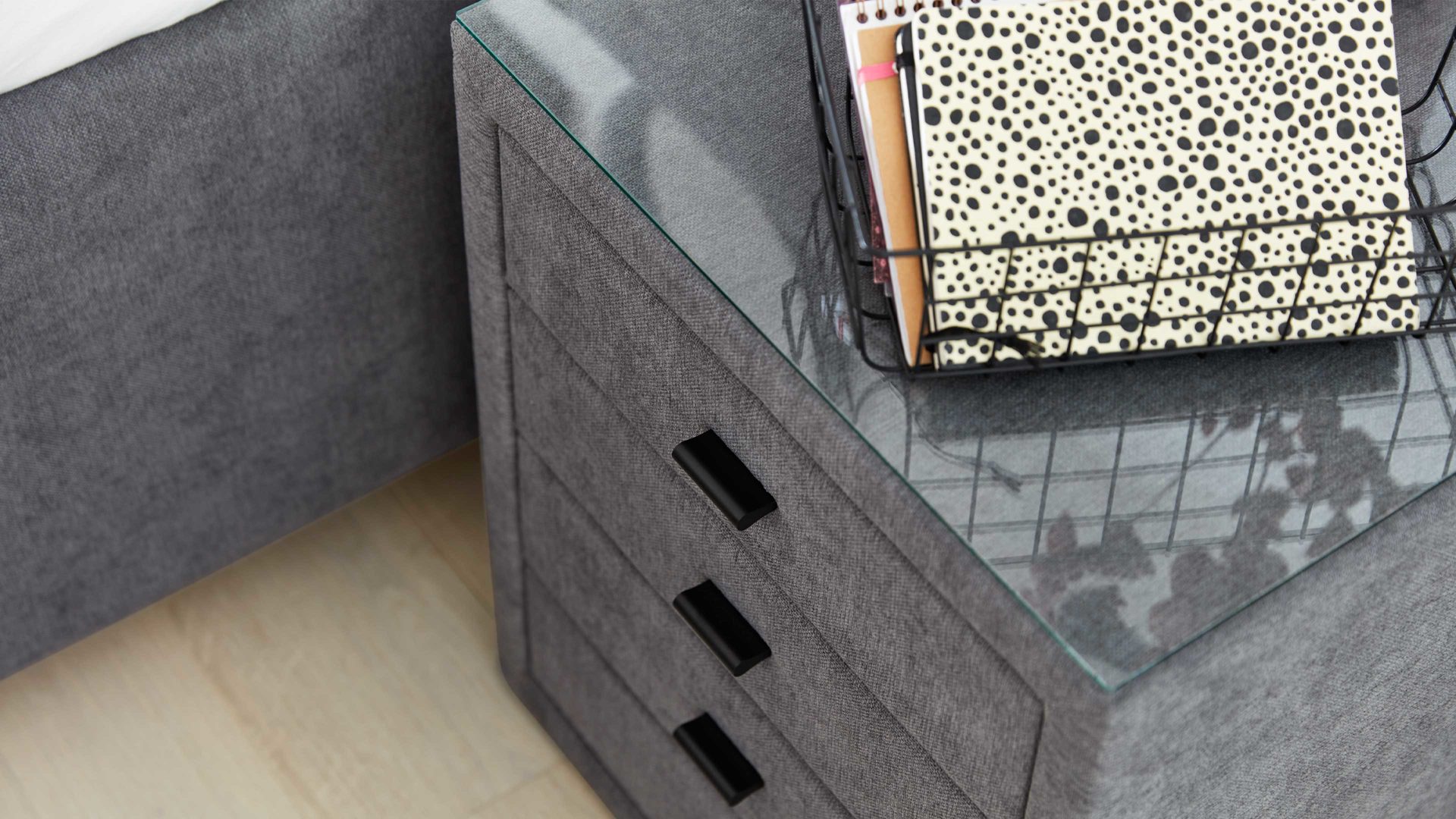 Die obere Ablagefläche eignet sich hervorragend für eine Nachttischlampe, Dekoelemente oder dein Smartphone. Für noch mehr Eleganz und Schutz lässt sich die Oberfläche optional mit einer separat erhältlichen Klarglasauflage veredeln.