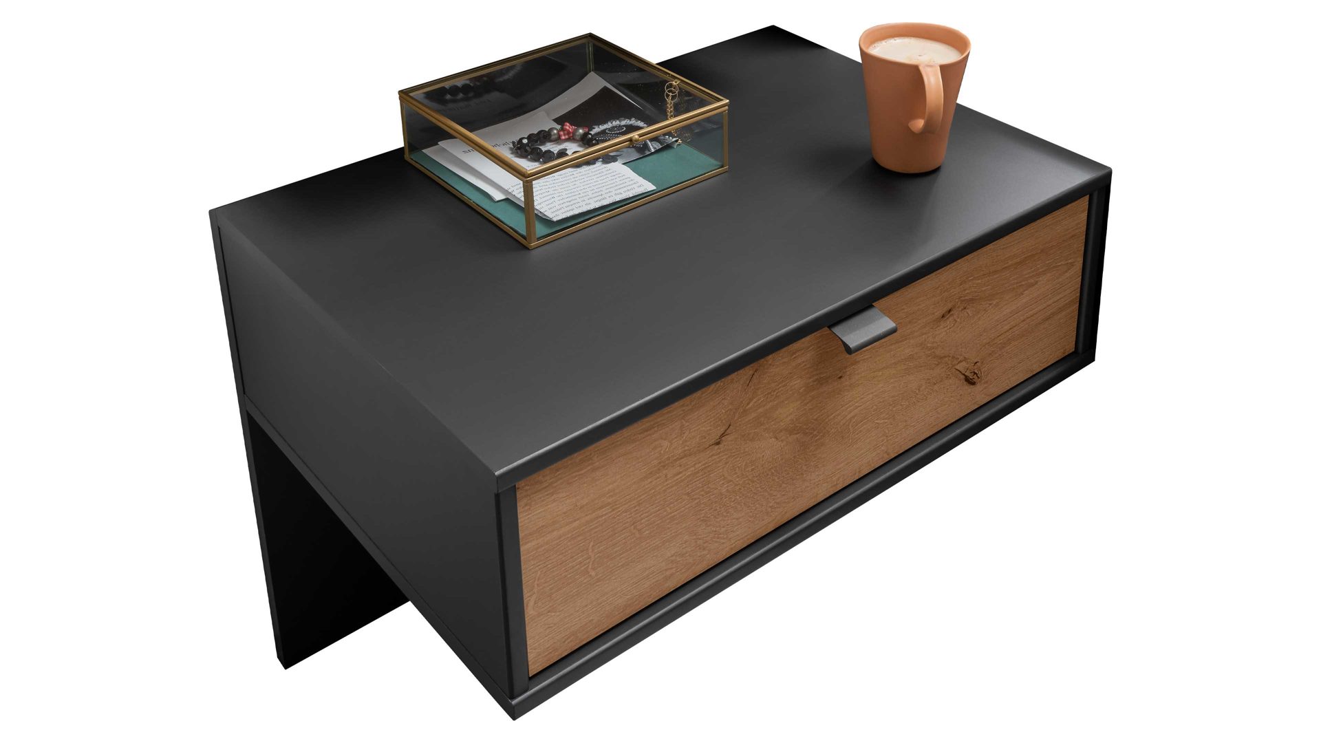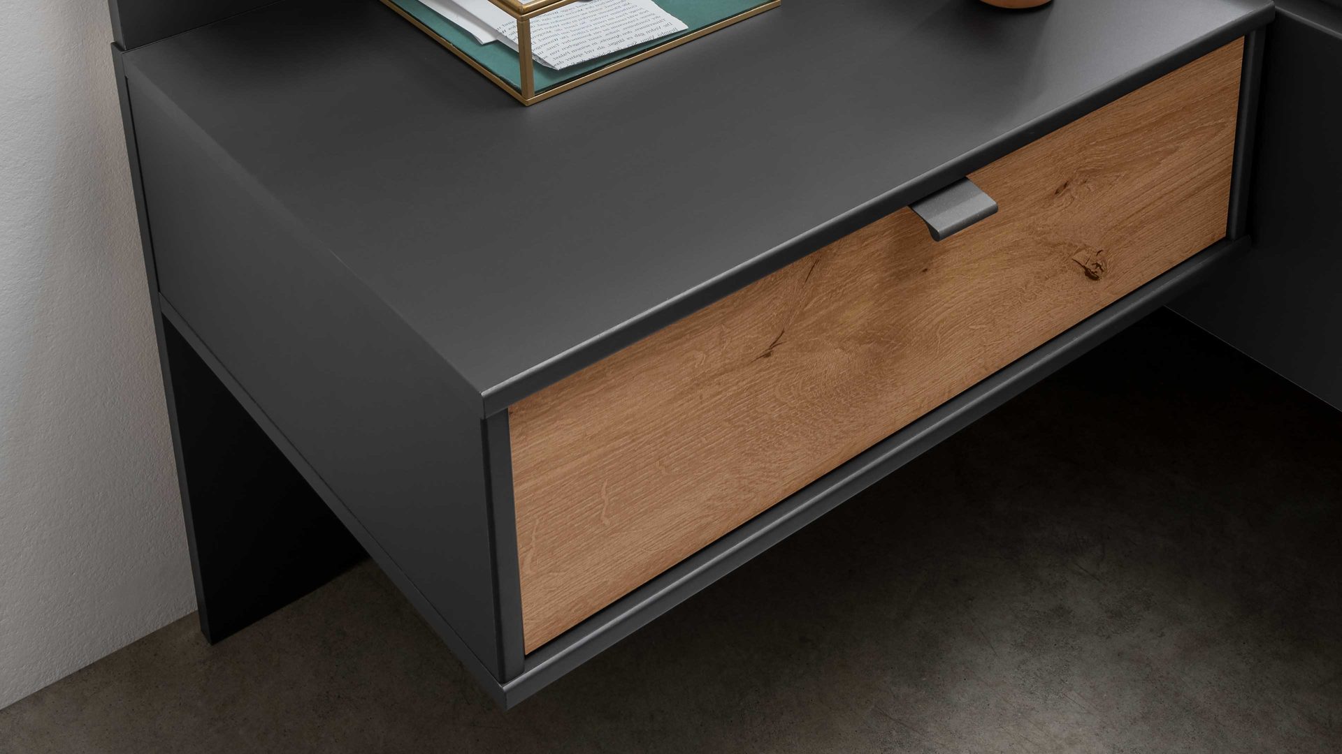 matte graphitfarbene Oberflächen, kombiniert mit biancofarbener Eiche-Nachbildung