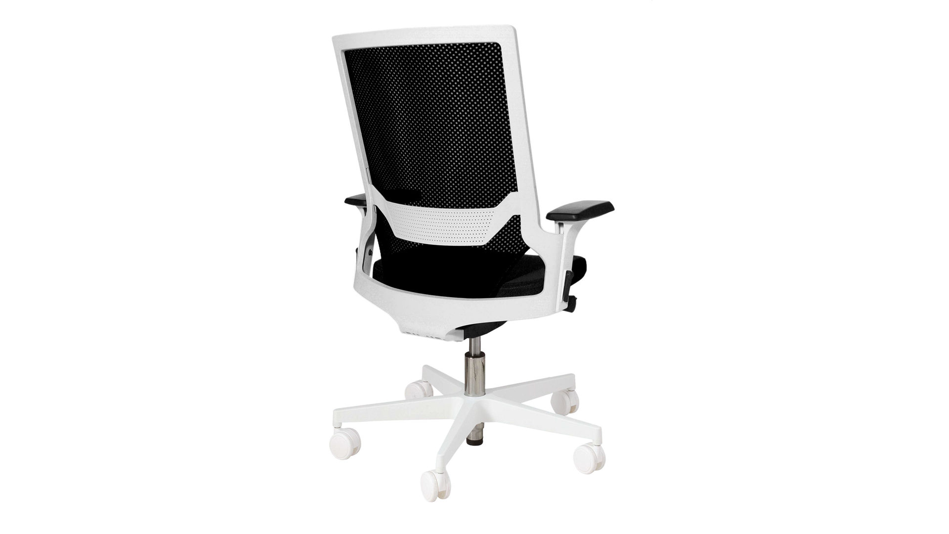 Der stilvolle Topstar Drehstuhl Autosyncron-1 kombiniert klassisch schwarzen Stoff- und Meshbezug mit einem weißen Kunststoff-Drehkreuz. Ebenfalls weiße Metall-Armlehnen mit einer wiederum schwarzen Polsterauflage runden das schwarz-weiße Design dieses modernen Bürostuhls harmonisch ab.