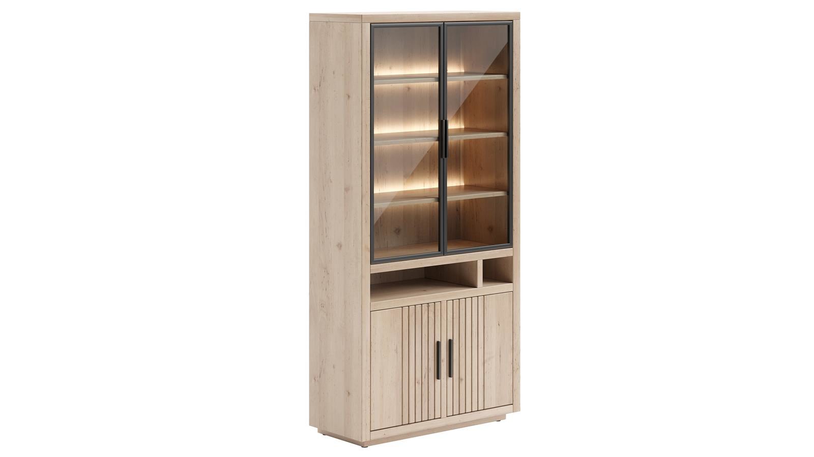 Die natürliche Farbgebung des Eichenholzes verleiht diesem Möbelstück eine warme und einladende Ausstrahlung, die jede Umgebung bereichert. Zusätzlich ist der Vitrine mit einer LED-Beleuchtung ausgestattet, die für eine angenehme Atmosphäre sorgt und Ihre Lieblingsstücke stilvoll in Szene setzt.