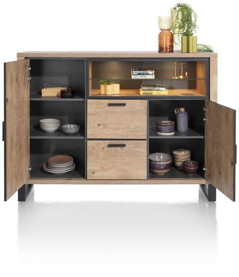 Mit seinen zwei Türen, zwei Schubladen und zwei Nischen bietet das Dressette reichlich Stauraum für Ihre persönlichen Gegenstände. Die LED-Beleuchtung setzt Ihre Lieblingsstücke gekonnt in Szene und verleiht Ihrem Raum eine einladende Atmosphäre.