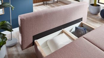 Dank der hochwertigen Polyschaumpolsterung sitzen Sie auf dem stilvollen Sofa sehr bequem. Das funktionale Highlight bildet der Querschläfer. Um den 2-Sitzer in eine größere Sitzlandschaft oder in ein Gästebett mit einer Liegefläche von ca. 140 x 193 cm (BxL) zu verwandeln, ziehen Sie einfach die Sitzfläche nach vorne aus und klappen dann die Rückenlehne nach vorne um. Praktisch ist überdies der geräumige, innen weiß beschichtete Bettkasten. Er bietet viel Platz für Decken und Kissen.