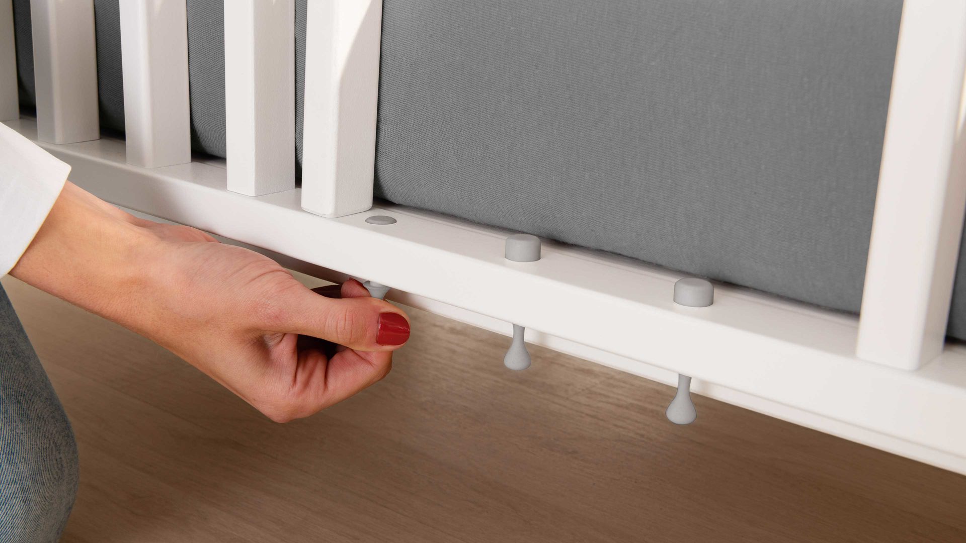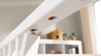 Zu den praktischen Höhepunkten des schadstofffrei lackierten Bettgestells gehören die vierfach höhenverstellbare Einlegetiefe sowie die drei herausnehmbaren Schlupfsprossen. Dabei sind die Knöpfe zum Fixieren dieser Schlupfsprossen kindgerecht weich. Durch die äußerst clevere Gestaltung können Sie das Gestell später zum Juniorbett umbauen.