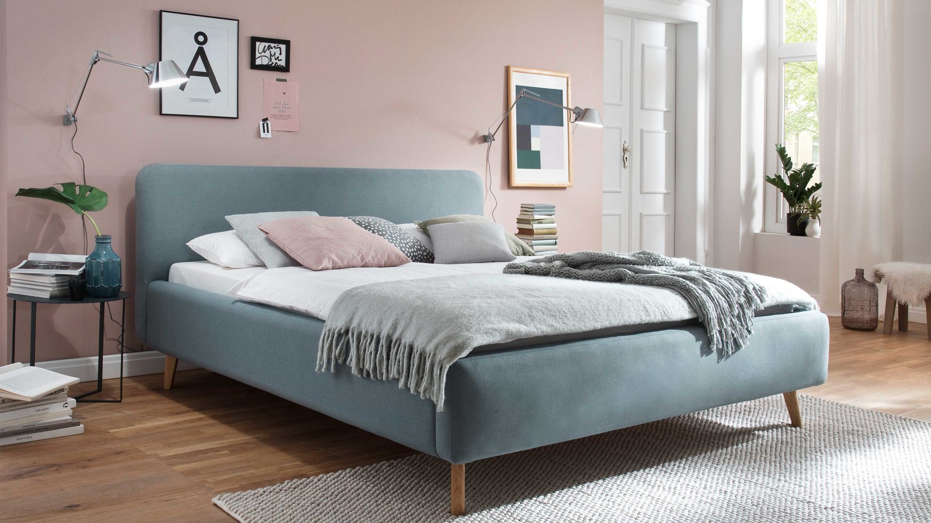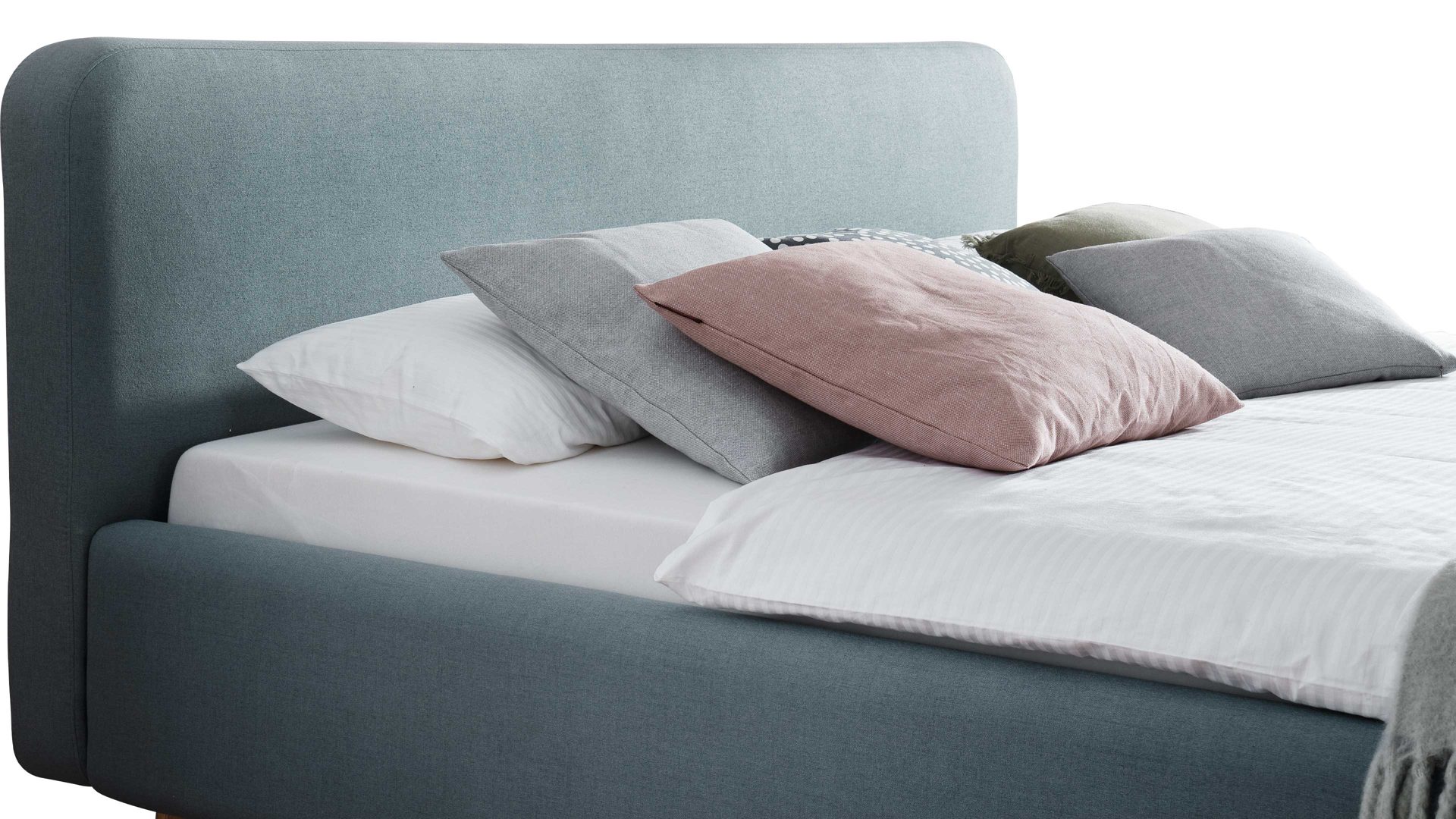 Die warme Farbe der Füße kontrastiert mit dem frischen Ton des Bezugs - und doch harmonieren die beiden Nuancen hervorragend und verführen zu Traumreisen - beziehungsweise Reiseträumen - ans Meer und einen herrlich warmen Sandstrand. Ein weiteres Highlight des rundum überzeugenden Bettgestells bildet das glatt bezogene Polsterkopfteil. Dieses ermöglicht durch die weiche Haptik auch entspannt angelehntes Sitzen, etwa abends beim Lesen vor dem Schlafen oder morgens beim Blick aus dem Fenster zum Wachwerden.