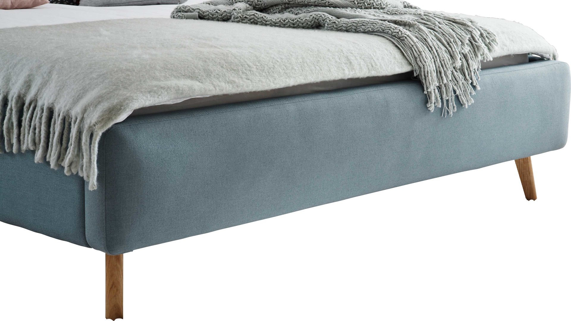Mit den eichefarbenen Holzfüßen und dem eisblauen Flachgewebebezug bringt das Polsterbettgestell Mattis maritimes Flair in Ihr Schlafzimmer.