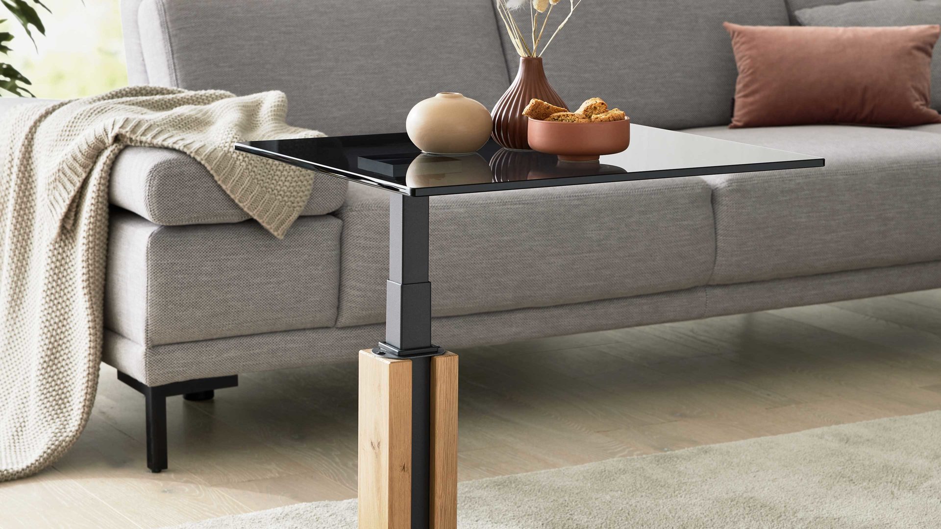 Auch technisch überzeugt der Beistelltisch auf ganzer Linie. Dank der verdeckten Rollen lässt er sich mühelos bewegen und flexibel positionieren – ideal für variable Wohnkonzepte. Die integrierte Hydro-Lift-Mechanik ermöglicht eine stufenlose Höhenverstellung um ca. 18 cm, sodass du den Tisch ganz einfach an deine Bedürfnisse anpassen kannst – ob als Sofabeistelltisch, praktische Ablage oder flexibler Arbeitsplatz.