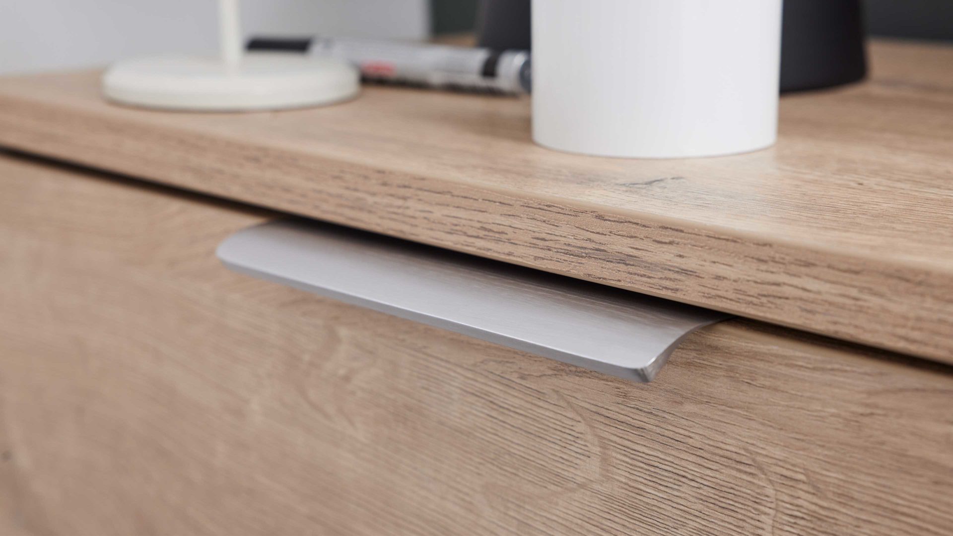 Die Kombination aus weißem Mattlack und Steineiche-Nachbildung verleiht dem Möbelstück eine moderne, freundliche Ausstrahlung. Metallelemente im Edelstahl-Finish setzen elegante Akzente und runden den Look hochwertig ab.