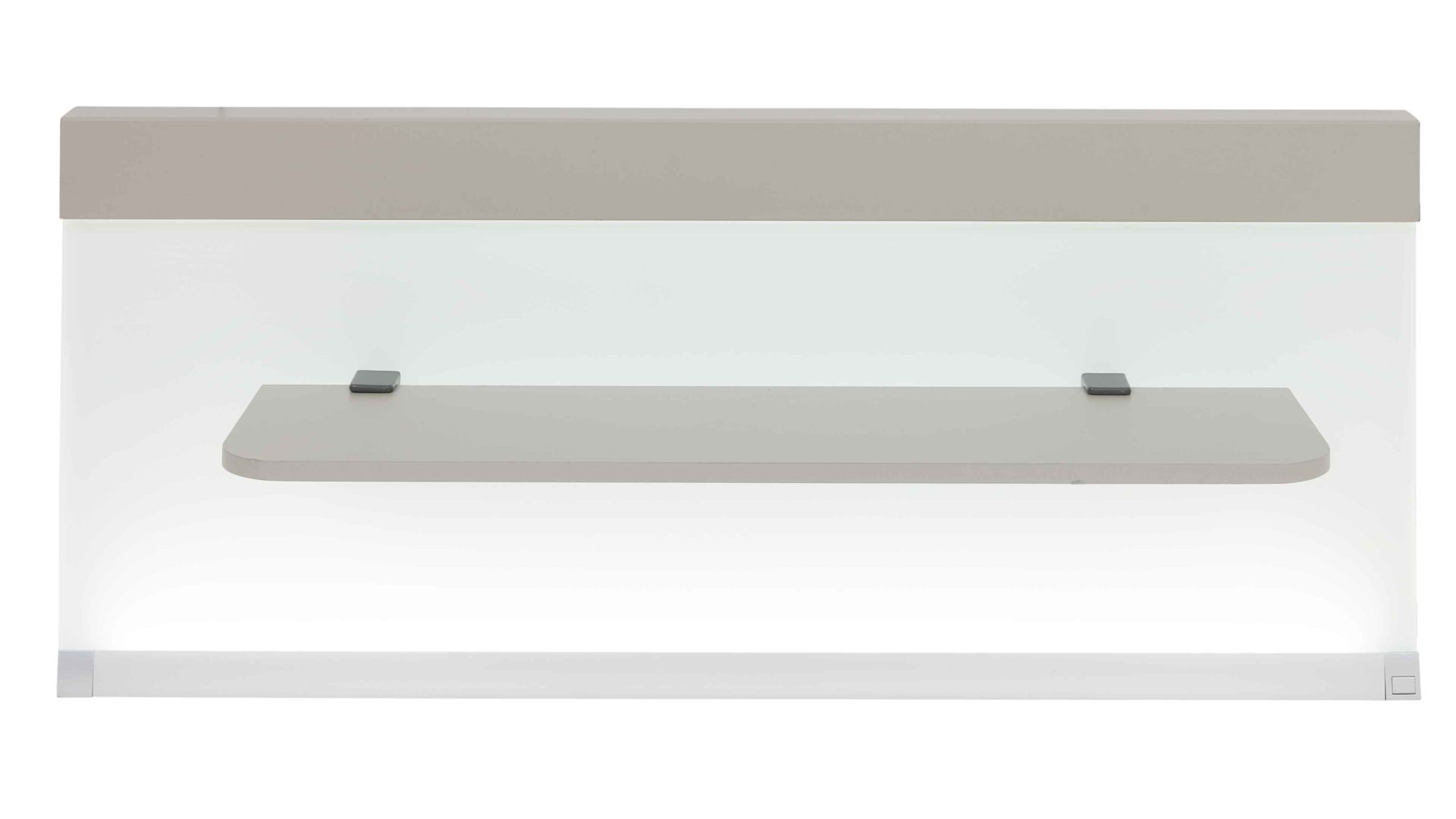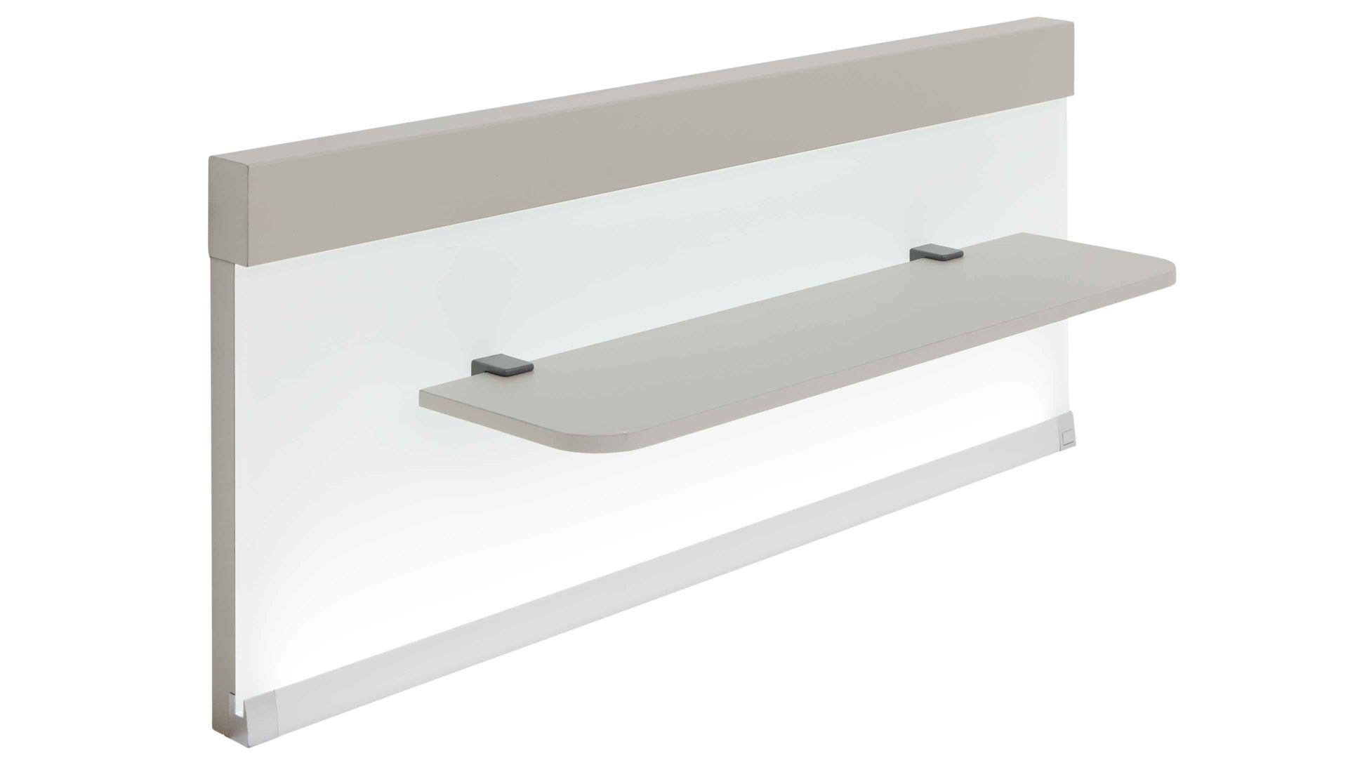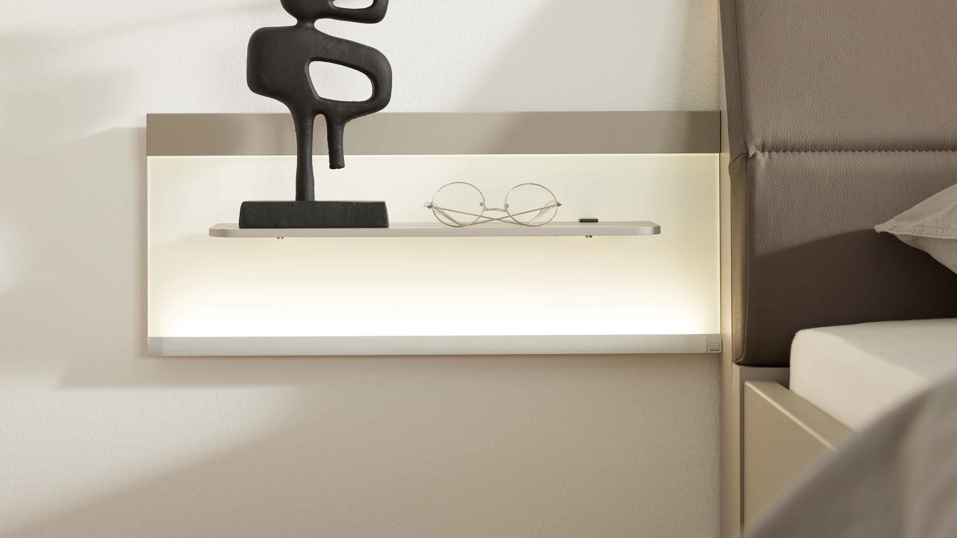 Die Kombination aus kieselgrauen und weißen Kunststoffoberflächen mit weißen Glasauflagen harmoniert perfekt mit der integrierten LED-Beleuchtung. Die fest verbauten LED-Leuchtmittel mit der Energieeffizienzklasse F (Spektrum A bis G) sorgen für ein dezentes, warmes Licht direkt am Bett. Über den praktischen Kippschalter steuerst du die Beleuchtung ganz bequem.