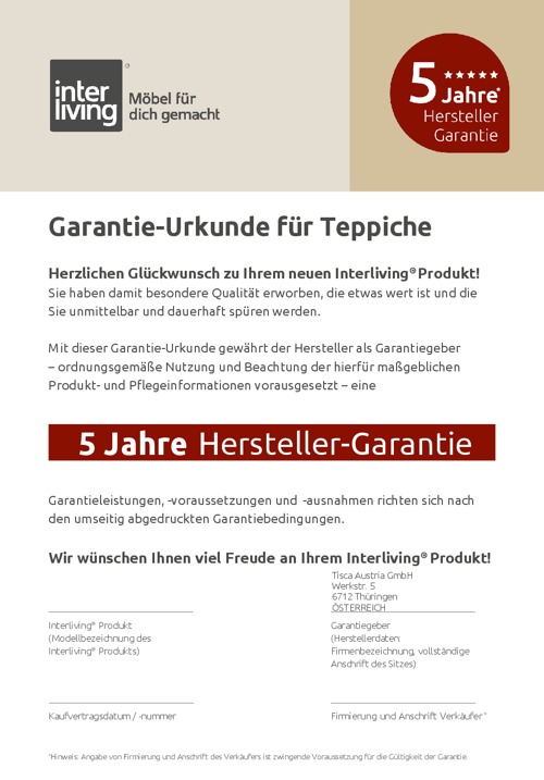 Die Interliving Teppich Serie B-8003 steht für nachhaltige Materialien, europäische Handwerkskunst und langlebige Qualität. Der Hersteller gewährt 5 Jahre Herstellergarantie, damit du lange Freude an diesem natürlichen Wohnaccessoire hast – Qualität, die man sieht und spürt.