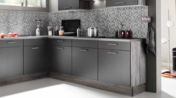 Die Fronten dieser pino Einbauküche sind vorrangig in Grafit designt, kombiniert mit Platingrau. Einen gelungenen Akzent setzen die Korpusseiten und Sockelblenden in Steineiche-Nachbildung. Die Arbeitsplatten präsentieren sich ebenfalls platingrau und steineichefarben. Schlichte Bügelgriffe runden die modern-elegante Optik stilvoll ab.