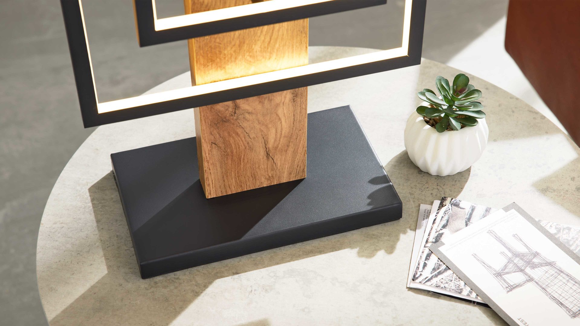 Die Leuchte überzeugt durch ihr ausdrucksstarkes, architektonisches Design: Ein Rechteck mit ca. 30 x 40 cm (B/L) und ein Quadrat mit ca. 20 x 20 cm (B/L) prägen ihre markante Silhouette. Mit Gesamtmaßen von ca. 30 x 62 x 22 cm (B/L x H x T) fügt sich die Innenraum-Tischlampe harmonisch in moderne Wohnkonzepte ein. Bedient wird sie bequem über einen Kabel-Wippschalter, der eine einfache Handhabung garantiert.