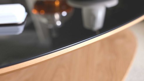 Während die Tischplatten mit den abgeschrägten Schweizer Kanten begeistern, zeichnet sich die Bodenplatte durch ihre edle Schliffoptik aus.