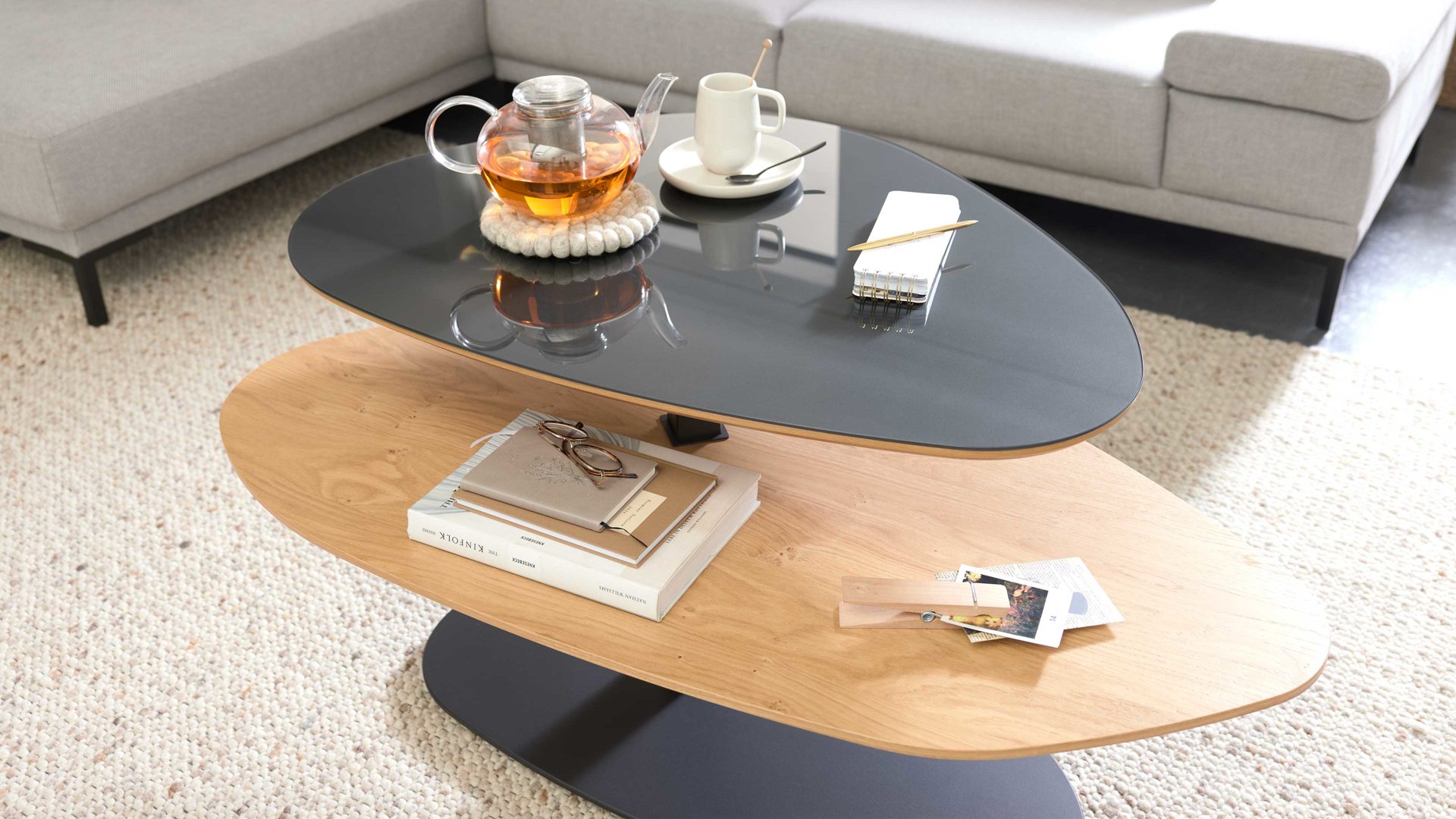 Sowohl das Glas als auch die Metall- und MDF-Elemente sind anthrazit-metallicfarben lackiert. Die holzfarbenen Teile des Wohnzimmertisches bestehen aus lackiertem Wildeichefurnier.